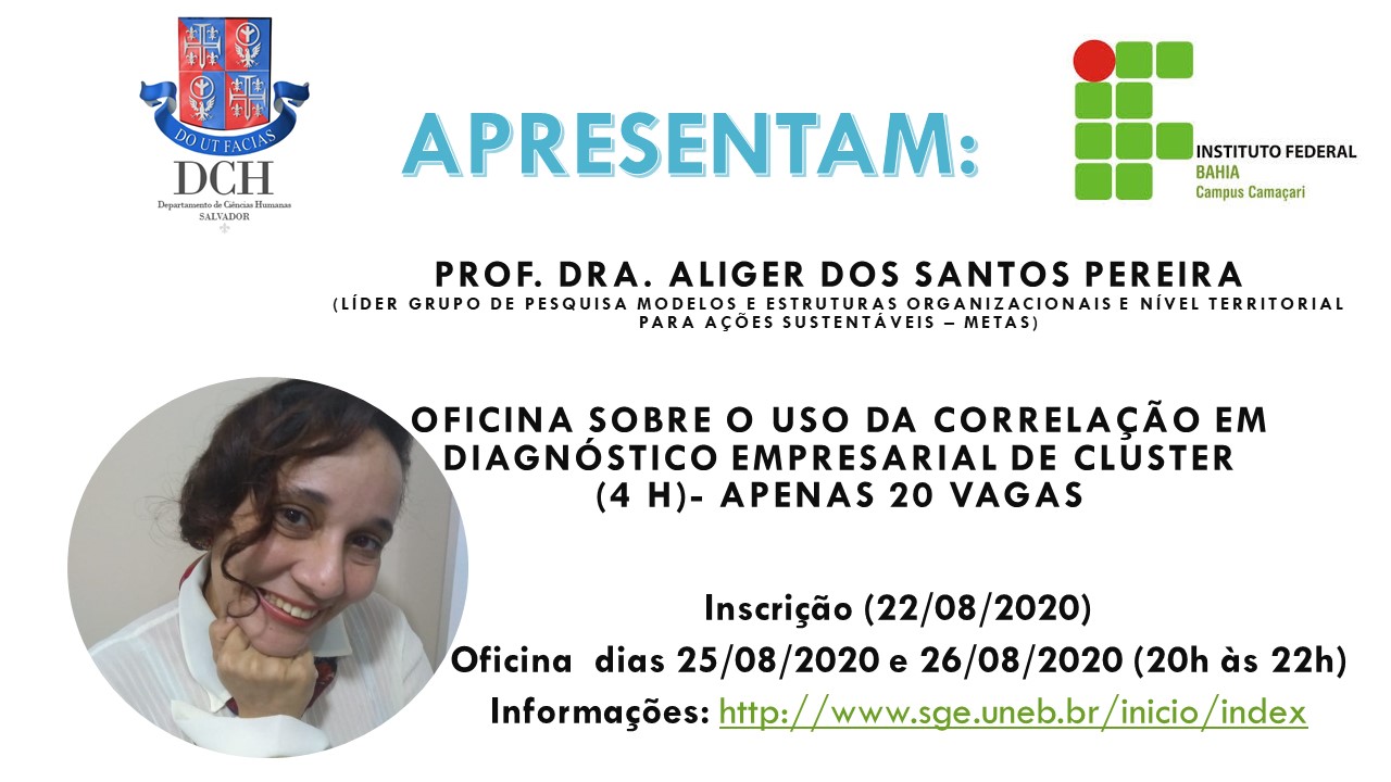 NUPE DCH I Inscrição - 22/08/2020 à 24/09/2020Trata-se de um curso em formato de oficina realizado entre a UNEB-DCH-1 e o IFBA (Instituição Parceira) fruto do trabalho de Grupo de Pesquisa denominado Pesquisa Modelos e estruturas organizacionais a nível territorial para ações sustentáveis- METAS ( linha de Pesquisa Modelos matemáticos e estatísticos). O Grupo de Pesquisa trabalha as organizações na Bahia (públicas, privadas ou do 3º setor) através de sua estrutura organizacional e de seus recursos disponíveis de forma a planejar, organizar , controlar , coordenar , aprimorar e/ou criar modelos quantitativos e/ou qualitativos capazes de promoverem a sustentabilidade e o empreendedorismo no território(seja a nível local, regional, nacional ou internacional) e a relação de todos os atores envolvidos direta ou indiretamente com esta estrutura, seja por exemplo com o uso de redes ou a partir de seus Clusters. Desta forma a Oficina é aberta a estudantes e a sociedade e possui conteúdo do Grupo de Pesquisa que é na área de Administração e busca associar a estatística . A Oficina visa mostrar a importância do uso da estatística, mas especificamente da correlação para diagnósticos empresariais em Clusters. Assim, ao coletar as coordenadas de Latitude (X) e Longitude (Y) das empresas é calculada a correlação com o objetivo de avaliar as redes existentes entre as empresas. Diante deste aspecto foi feita a seguinte pergunta:-Qual(is) a(s) características inerentes a proximidade existente entre as Instituições presentes no Cluster através do uso do geoprocessamento? Percebe-se que há uma relação de complementariedade entre as atividades dentro do Cluster e que as Instituições estão relacionadas em rede intra e intercluster, conteúdo debatidos no grupo de Pesquisa Modelos e estruturas organizacionais a nível territorial para ações Sustentáveis - METAS (Linhja de Pesquisa Modelos Matemáticos e Estatísticos). A Oficina é denominado "O uso da Correlação em Diagnóstico Empresarial de Cluster", e ofertará 20 vagas nos dias 25 e 26/08 das 20:00 as 22:00 através do Link: https://conferenciaweb.rnp.br/webconf/aligerpereira. As inscrições serão realizadas no Link: https://doity.com.br/viii-encontro-de-matematica-ifbacampus-de-camacari O certificado será emitido pela Instituição Parceira (IFBA). Site do evento: https://sites.google.com/site/colmifbacamacari/enmat?pli=1 TÍTULO DO CURSO: O Uso da Correlação em Diagnostico Empresarial de Cluster (Oficina de Mini curso) COORDENADOR (A): ALIGER DOS SANTOS PEREIRA PÚBLICO ALVO: PROFESSOR, ESTUDANTES E SOCIEDADE INICIO DA INSCRIÇÃO: 22/08/2020 TÉRMINO DA INSCRIÇÃO: 24/08/2020 (Enquanto tiver vaga) INÍCIO DO CURSO: 25/08/2020NÚMERO DE VAGAS: 20 INÍCIO DO CURSO: 25/08/2020 CARGA HORÁRIA: 4h