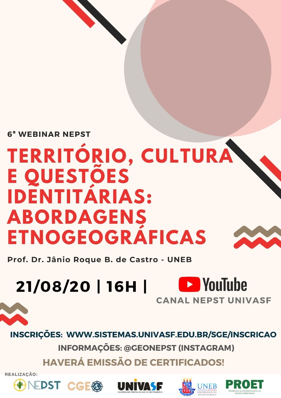 Prezado(a), A Universidade Federal do Vale do São Francisco (UNIVASF) e a Universidade do Estado da Bahia (UNEB), por meio do Núcleo de Estudos das Paisagens Semiáridas Tropicais (NEPST), vêm respeitosamente solicitar a V.Sa. divulgação da 6ª Webinar intitulada "Território, cultura e questões identitárias: abordagens etnogeográficas", que será ministrada pelo Prof. Dr. Jânio Roque Barros de Castro (UNEB, Campus V) no dia 21 de agosto de 2020 às 16:00. A 6ª Webinar do NEPST visa promover o aperfeiçoamento da comunidade acadêmica em razão da necessidade de se manter atualizada, considerando o contexto de distanciamento social ocasionado pela pandemia da COVID-19. Essa iniciativa representa compromisso social da UNIVASF (Campus Senhor do Bonfim) e UNEB (Campus I e IV) no que se refere à valorização profissional mediante cursos de formação continuada. Ressaltamos que essa ação de extensão é gratuita e haverá emissão de certificados de participação aos ouvintes. A transmissão ocorrerá pelo canal do YouTube no endereço eletrônico: