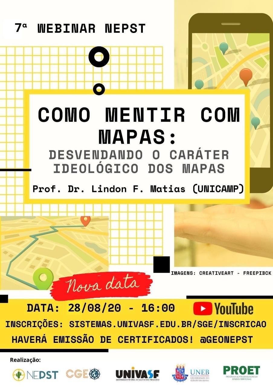 Prezado (a), A Universidade Federal do Vale do São Francisco (UNIVASF) e a Universidade do Estado da Bahia (UNEB), por meio do Núcleo de Estudos das Paisagens Semiáridas Tropicais (NEPST), vêm respeitosamente solicitar a V.Sa. divulgação da 7ª Webinar intitulada "Como mentir com mapas: desvendando o caráter ideológico dos mapas", que será ministrada pelo Prof. Dr. Lindon Fonseca Matias (UNICAMP) no dia 28 de agosto de 2020 às 16:00. A 7ª Webinar do NEPST visa promover o aperfeiçoamento da comunidade acadêmica em razão da necessidade de se manter atualizada, considerando o contexto de distanciamento social ocasionado pela pandemia da COVID-19. Essa iniciativa representa compromisso social da UNIVASF (Campus Senhor do Bonfim) e UNEB (Campus I e IV) no que se refere à valorização profissional mediante cursos de formação continuada. Ressaltamos que essa ação de extensão é gratuita e haverá emissão de certificados de participação aos ouvintes. Os interessados devem realizar a inscrição no endereço eletrônico: