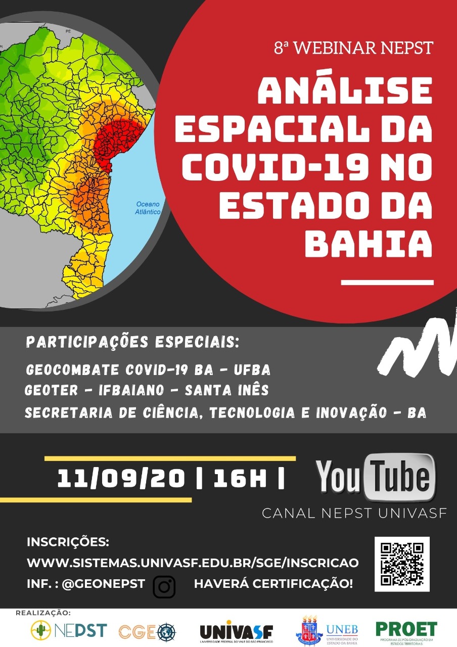 Prezado (a), A Universidade Federal do Vale do São Francisco (UNIVASF) e a Universidade do Estado da Bahia (UNEB), por meio do Núcleo de Estudos das Paisagens Semiáridas Tropicais (NEPST), do Grupo GeoCombate Covid-19 BA (UFBA), Grupo de Estudos Geografia dos Territórios e Espaços Rurais (GEOTER – IFBAIANO- Santa Inês) e a Secretaria de Ciência, Tecnologia e Inovação (BA) tem a honra de convidar a V.Sa. para a 8ª Webinar intitulada "Análise Espacial da COVID-19 no Estado da Bahia", que ocorrerá no dia 11 de setembro de 2020 às 16:00. A 8ª Webinar do NEPST visa promover o aperfeiçoamento da comunidade acadêmica em razão da necessidade de se manter atualizada, considerando o contexto de distanciamento social ocasionado pela pandemia da COVID-19. Essa iniciativa representa compromisso social da UNIVASF (Campus Senhor do Bonfim) e UNEB (Campi I e IV) no que se refere à valorização profissional mediante cursos de formação continuada. Ressaltamos que essa ação de extensão é gratuita e haverá emissão de certificados de participação aos ouvintes que durante o evento confirmarem sua participação no link disponibilizado durante a Webinar. Os interessados devem realizar a inscrição no endereço eletrônico: