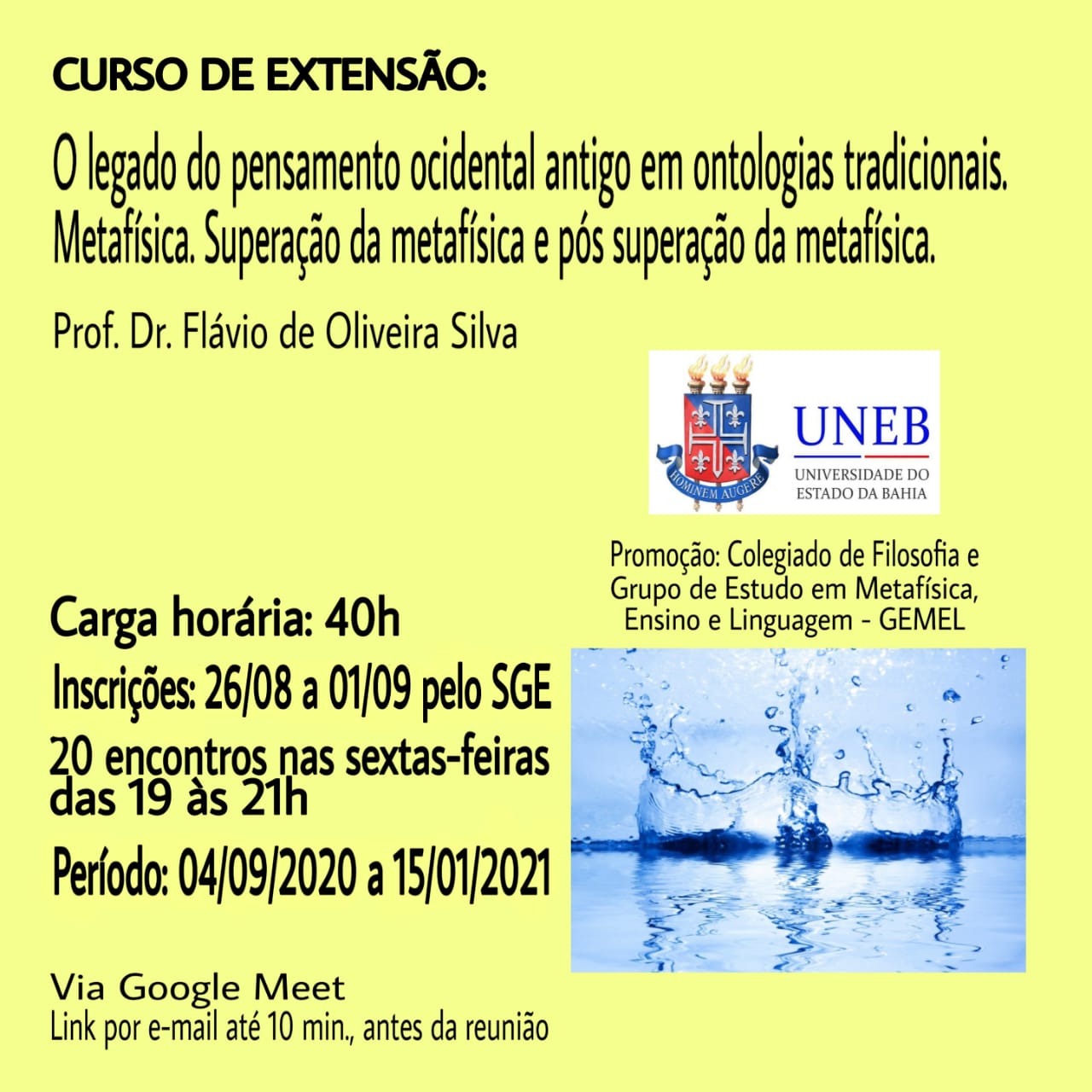 NUPE DEDC I Inscrição - 26/08/2020 à 01/09/2020O legado do pensamento ocidental antigo em ontologias tradicionais. Metafísica. Superação da metafísica e pós-superação da metafísica] RESUMO: O curso se divide em quatro partes: 1- apresenta um recorte de paradigmas do pensamento ocidental antigo como fundamento para o surgimento da filosofia enquanto saber. Explicita passagens do pensamento parmenídico e heraclitiano que determinaram o pensamento racional do ocidente. 2- identifica em ontologias da metafísica tradicional, pressupostos do pensamento inaugural do ocidente, com vistas a formular seu domínio na noção do sujeito cartesiano, na vontade de poder nietzschiana e na ontologia fundamental de Heidegger. 3- tematiza a concepção de metafísica tradicional e a reivindicação contemporânea de sua superação. Pontuaremos as contribuições do Círculo de Viena, as investidas de Rudoph Carnap e o contraponto da reorientação dada por Heidegger para a questão da superação da metafísica. 4- Explicita desdobramentos que se seguem pós a superação da metafísica. Destacaremos encaminhamentos de pesquisas sociais e filosóficas contemporâneas, sobretudo a partir do século XX, tensionadas com o movimento da contracultura que visou a quebra de velhos paradigmas e abertura de novas possibilidades para o pensamento. OBJETIVO GERAL: Apresentar os pressupostos iniciais do pensamento Ocidental Antigo e seu desdobramento como marco fundante e condutor da filosofia tradicional no Ocidente. OBJETIVOS ESPECÍFICOS: Apresentar os pressupostos do pensamento Ocidental Antigo, a partir de fragmentos dos textos de Parmênides e Heráclito. Caracterizar o surgimento da filosofia e a consequente instauração do saber racional como ambiência considerada necessária ao marco civilizatório. Identificar e explicitar pressupostos do pensamento ocidental antigo na formulação da noção de sujeito cartesiano; vontade de poder nietzschiana e na ontologia fundamental heideggeriana. Tematizar o conceito de metafísica e a problemática a ela concernente, a partir do pensamento de Heidegger. Apresentar o projeto filosófico de superação da metafísica protagonizado por Rudoph Carnap, a partir das contribuições do Círculo de Viena. Expor e problematizar o projeto de superação da metafísica em Heidegger. Apresentar e discutir encaminhamentos de pesquisas atuais. Relações e ruptura com a filosofia tradicional. Caminhos da filosofia pós-superação da metafísica.