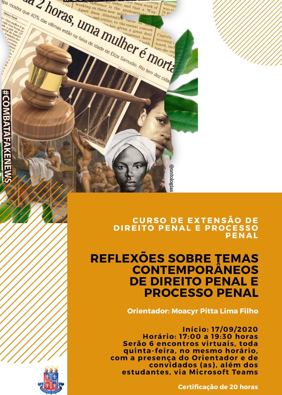 NUPE DCH I Inscrição - 26/08/2020 à 14/09/2020Curso de Extensão O curso consiste na realização de encontros semanais, com o objetivo de discutir temas contemporâneos relacionados ao direito penal e processual penal, com a presença de convidados e do professor orientador, visando suscitar debates críticos e de relevante importância acerca dos temas apresentados, agregando à toda comunidade. COORDENADOR (A): Moacyr Pitta Lima Filho PÚBLICO ALVO: Comunidade em geral INICIO DA INSCRIÇÃO: 26 de agosto TÉRMINO DA INSCRIÇÃO: 05 de setembro de 2020 INICIO DO CURSO: 17 de setembro de 2020 NÚMERO DE VAGAS: 150 CARGA HORÁRIA: 20h