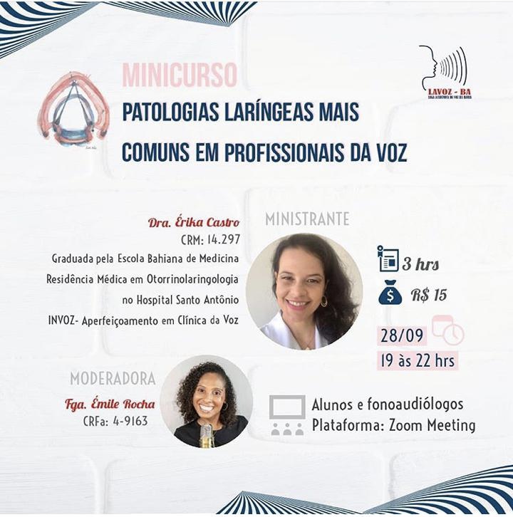 DCVI Inscrição - 30/08/2020 à 14/10/2020MiniCurso: Patologias Laríngeas mais Comuns em Profissionais da Voz promovido pela Liga de Voz da Bahia - LAVOZ (BA). Carga horária : 3h Público: Discentes do curso de Fonoaudiologia e Fonoaudiólogos. Plataforma: Zoom Palestrante: Dra Erika Castro - Otorrinolaringologista.