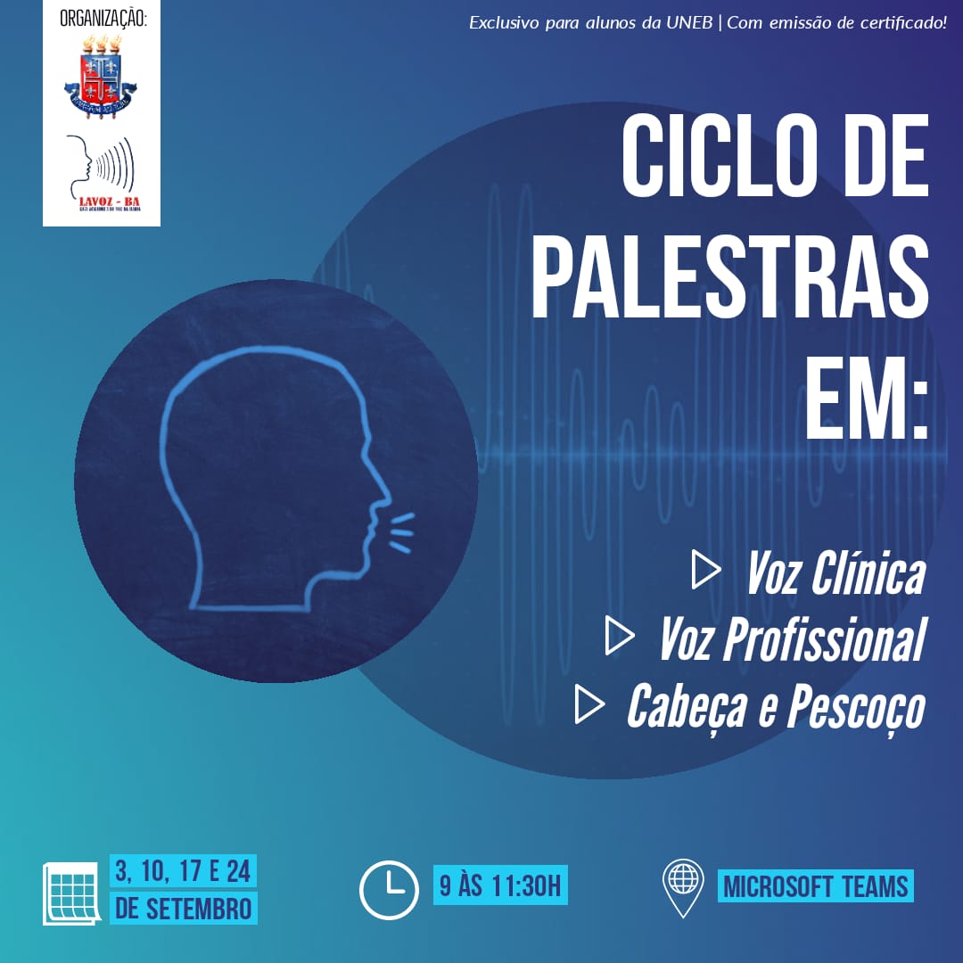 DCVI Inscrição - 25/08/2020 à 03/11/2020Ciclo de Palestra em Voz, Voz profissional e Cabeça e Pescoço, coordenado pelas docentes do Colegiado de Fonoaudiologia Me Fga. Émile Rocha Santana, Dra. Fga. Renata Scarpel e Dra. Fga. Flávia Fialho e organizado pela Liga de Voz da Bahia ( LAVOZ). Serão ministrada palestras envolvendo profissionais da saúde de áreas afins as quinta-feiras pela manhã de Setembro e Outubro de 2020. As palestras serão ministradas pela Plataforma Microsoft Teams.