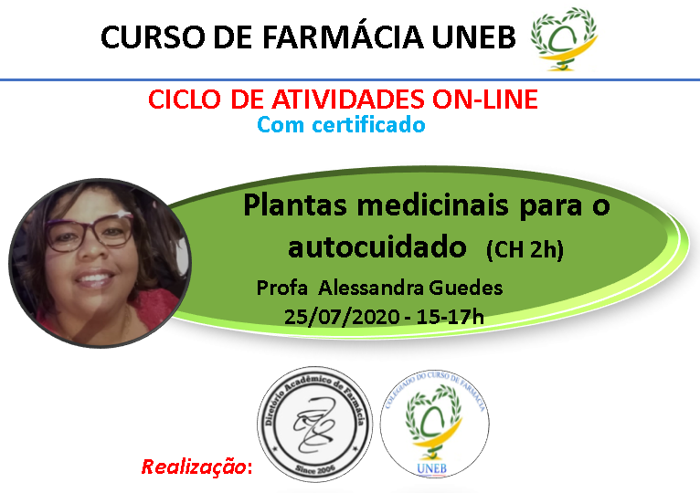 DCVI Inscrição - 20/07/2020 à 25/07/2020Prezados alunos do curso de Farmácia da UNEB e demais interessados, Para promover o conhecimento durante a suspensão das atividades presenciais devido a pandemia, a Coordenação do Colegiado e o Diretório Acadêmico do curso de Farmácia promovem atividades on-line semanais, com direito a certificação. Entramos na 9a semana, com mais 2 palestras: > 24/07 - 15 às 17h - Palestra "Revisão em Química Medicinal: Propriedades físico-químicas dos fármacos" - Profa. Camila Brito > 25/07 - 15 às 17h - Palestra "Plantas medicinais para o autocuidado" - Profa. Alessandra Guedes Importante: - Alunos de qualquer instituição/curso podem se inscrever; - Inscrições de cada palestra se encerrarão 6 horas antes da sua realização, ou quando se esgotarem as vagas (200); - Atividades ocorrerão pelo MICROSOFT TEAMS, cujo link de acesso será enviado por e-mail com 3 horas de antecedência do início da palestra; - Vagas serão prioritárias a alunos do curso de Farmácia da UNEB; - Concessão do certificado será condicionada ao rendimento de 60% (ou maior) em rápida avaliação on-line, aplicada ao final da atividade; Dúvidas e atualizações, use redes sociais do Instagram -- >> @colfaruneb e @dafaruneb. Contra o Covid-19 #sepuderficaemcasa