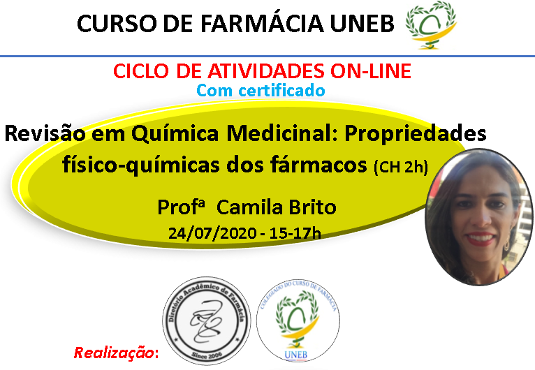 DCVI Inscrição - 20/07/2020 à 24/07/2020Prezados alunos do curso de Farmácia da UNEB e demais interessados, Para promover o conhecimento durante a suspensão das atividades presenciais devido a pandemia, a Coordenação do Colegiado e o Diretório Acadêmico do curso de Farmácia promovem atividades on-line semanais, com direito a certificação. Entramos na 9a semana, com mais 2 palestras: > 24/07 - 15 às 17h - Palestra "Revisão em Química Medicinal: Propriedades físico-químicas dos fármacos" - Profa. Camila Brito > 25/07 - 15 às 17h - Palestra "Plantas medicinais para o autocuidado" - Profa. Alessandra Guedes Importante: - Alunos de qualquer instituição/curso podem se inscrever; - Inscrições de cada palestra se encerrarão 6 horas antes da sua realização, ou quando se esgotarem as vagas (200); - Atividades ocorrerão pelo MICROSOFT TEAMS, cujo link de acesso será enviado por e-mail com 3 horas de antecedência do início da palestra; - Vagas serão prioritárias a alunos do curso de Farmácia da UNEB; - Concessão do certificado será condicionada ao rendimento de 60% (ou maior) em rápida avaliação on-line, aplicada ao final da atividade; Dúvidas e atualizações, use redes sociais do Instagram -- >> @colfaruneb e @dafaruneb. Contra o Covid-19 #sepuderficaemcasa