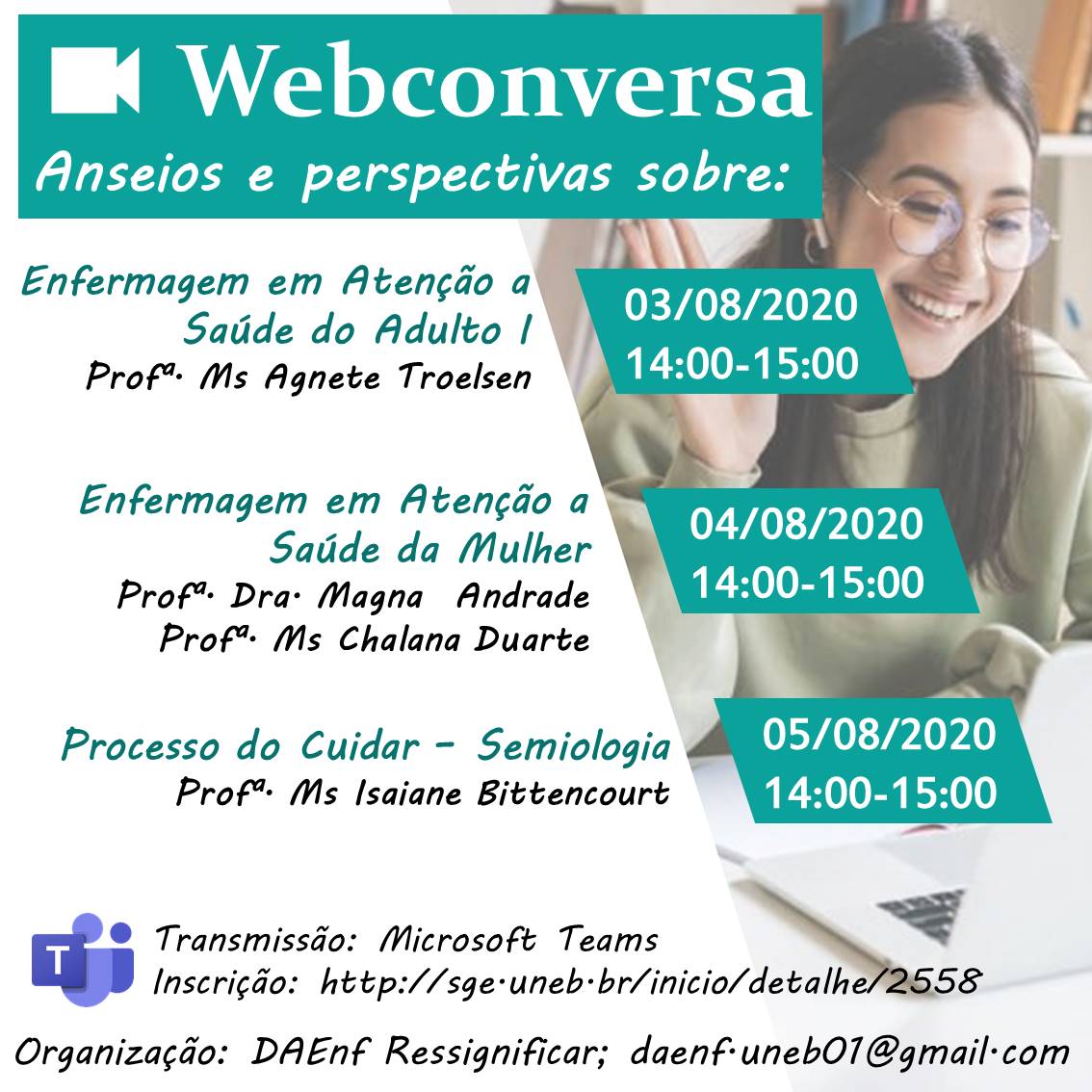 NUPE DEDCVII Inscrição - 23/07/2020 à 03/08/2020O Diretório Acadêmico de Enfermagem e o Colegiado de Enfermagem da UNEB/Campus VII promovem a Webconversa: Anseios e Perspectivas sobre os Componentes Curriculares, que visa apresentar alguns componentes curriculares e oportunizar aos discentes um espaço de diálogo em conjunto com as professoras responsáveis pelos componentes curriculares. Você é livre para escolher quais dias deseja participar e o certificado será gerado de acordo com sua escolha. Vemo-nos na Webconversa!