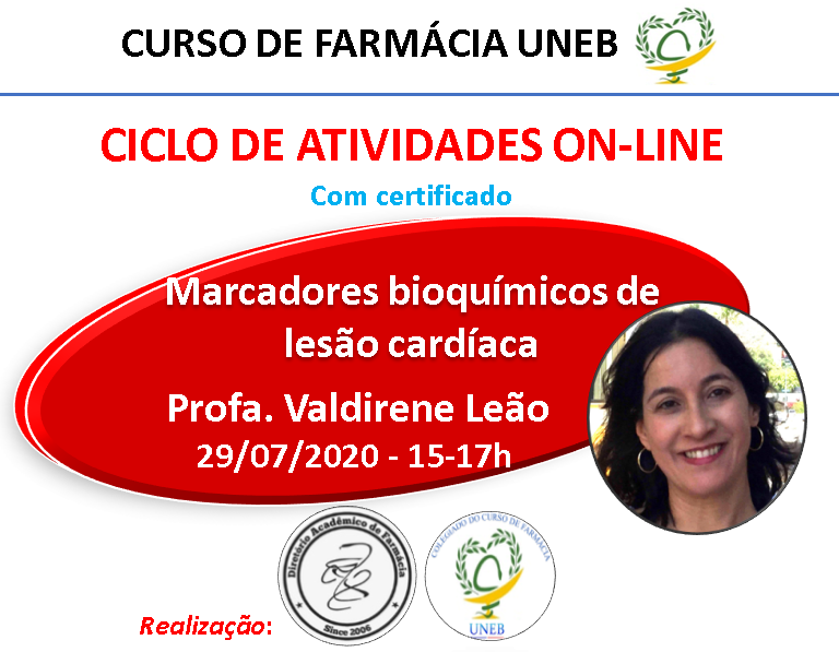 DCVI Inscrição - 27/07/2020 à 29/07/2020Prezados alunos do curso de Farmácia da UNEB e demais interessados, Para promover o conhecimento durante a suspensão das atividades presenciais devido a pandemia, a Coordenação do Colegiado e o Diretório Acadêmico do curso de Farmácia promovem atividades on-line semanais, com direito a certificação. Entramos na 10a semana, com o seguinte tema: > 29/07 - 15 às 17h - Palestra "Marcadores de Lesão Cardíaca" - Profa. Valdirene Leão Importante: - Alunos de qualquer instituição/curso podem se inscrever; - Inscrições de cada palestra se encerrarão 6 horas antes da sua realização, ou quando se esgotarem as vagas (200); - Atividades ocorrerão pelo MICROSOFT TEAMS, cujo link de acesso será enviado por e-mail com 3 horas de antecedência do início da palestra; - Vagas serão prioritárias a alunos do curso de Farmácia da UNEB; - Concessão do certificado será condicionada ao rendimento de 60% (ou maior) em rápida avaliação on-line, aplicada ao final da atividade; Dúvidas e atualizações, use redes sociais do Instagram -- >> @colfaruneb e @dafaruneb. Contra o Covid-19 #sepuderficaemcasa