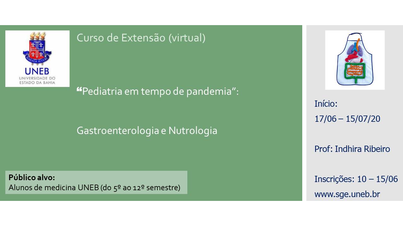 DCVI Inscrição - 10/06/2020 à 19/06/2020O grupo de pediatria da Universidade do Estado da Bahia propõe uma atividade de extensão com o objetivo de contribuir para ampliar a compreensão sobre diversos temas de pediatria, através da discussão de casos clínicos e sob orientação de professores com diferentes especialidades dentro da prática pediátrica. O curso será na modalidade à distância, através de multiplataforma digital. O mesmo terá duração de 4 semanas. Os encontros virtuais serão com discussão de casos clínicos (2 horas/ semana), precedido de estudo dirigido (4 horas/ semana) sobre os temas discutidos (com material a ser encaminhado pelo professor via e-mail ou plataforma digital). Carga horária total de 6 horas semanais. Serão oferecidos 5 módulos de assuntos, sendo cada turma com um professor. As turmas serão compostas de 10 alunos, podendo o aluno inscrever-se em mais de uma turma, de acordo com a disponibilidade. Será emitido certificado para cada aluno que tenha participação de 75% ou mais. Módulo de Gastroenterologia e Nutrologia (Prof. Indhira Ribeiro) – quarta - das 8 – 10h. 1. Dor abdominal na emergência (01/07/20) 2. Lactente com problemas no aleitamento materno (08/07) 3. Diarreia aguda e reposição volêmica (15/07) 4. Diarreia crônica (22/07)
