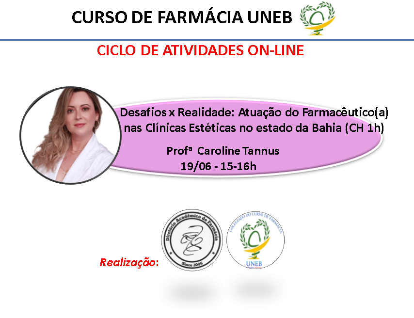 DCVI Inscrição - 15/06/2020 à 19/06/2020Prezados alunos do curso de Farmácia da UNEB, Para promover o conhecimento durante a suspensão das atividades presenciais devido a pandemia, a Coordenação do Colegiado e o Diretório Acadêmico do curso de Farmácia promovem atividades on-line semanais, com direito a certificação. Entramos na quarta semana, com mais 2 palestras: > 18/06 - 15 às 17h - Legislação Farmacêutica - Profa. Mila Pacheco > 19/06 - 15 às 16h - Palestra "Desafios x Realidade: Atuação do Farmacêutico(a) nas Clínicas Estéticas no estado da Bahia" - Profa. Caroline Tannus Importante: - Atividades ocorrerão pelo MICROSOFT TEAMS, cujo link de acesso será enviado por e-mail; - Inscrições de cada palestra se encerrarão às 17h do dia anterior, ou quando as vagas forem esgotadas; - Alunos de qualquer instituição/curso podem se inscrever; - Vagas serão prioritárias a alunos de farmácia da UNEB; - Concessão do certificado será condicionada ao rendimento de 60% (ou maior) em rápida avaliação on-line, aplicada ao final da atividade; Dúvidas e atualizações, use redes sociais do Instagram -- >> @colfaruneb e @dafaruneb. Contra o Covid-19 #ficaemcasa