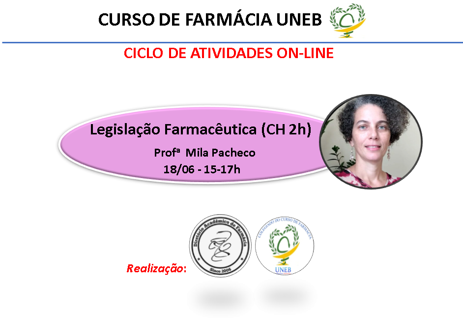 DCVI Inscrição - 15/06/2020 à 18/06/2020Prezados alunos do curso de Farmácia da UNEB, Para promover o conhecimento durante a suspensão das atividades presenciais devido a pandemia, a Coordenação do Colegiado e o Diretório Acadêmico do curso de Farmácia promovem atividades on-line semanais, com direito a certificação. Entramos na quarta semana, com mais 2 palestras: > 18/06 - 15 às 17h - Legislação Farmacêutica - Profa. Mila Pacheco > 19/06 - 15 às 16h - Palestra "Desafios x Realidade: Atuação do Farmacêutico(a) nas Clínicas Estéticas no estado da Bahia" - Profa. Caroline Tannus Importante: - Atividades ocorrerão pelo MICROSOFT TEAMS, cujo link de acesso será enviado por e-mail; - Inscrições de cada palestra se encerrarão às 17h do dia anterior, ou quando as vagas forem esgotadas; - Alunos de qualquer instituição/curso podem se inscrever; - Vagas serão prioritárias a alunos de farmácia da UNEB; - Concessão do certificado será condicionada ao rendimento de 60% (ou maior) em rápida avaliação on-line, aplicada ao final da atividade; Dúvidas e atualizações, use redes sociais do Instagram -- >> @colfaruneb e @dafaruneb. Contra o Covid-19 #ficaemcasa