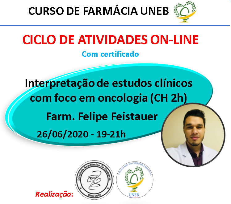DCVI Inscrição - 22/06/2020 à 26/06/2020Prezados alunos do curso de Farmácia da UNEB, Para promover o conhecimento durante a suspensão das atividades presenciais devido a pandemia, a Coordenação do Colegiado e o Diretório Acadêmico do curso de Farmácia promovem atividades on-line semanais, com direito a certificação. Entramos na quinta semana, com o seguinte tema: > 26/06 - 19 às 21h - Interpretação de estudos clínicos com foco em oncologia - Farm. Felipe Feistauer. Importante: - Atividades ocorrerão pelo MICROSOFT TEAMS, cujo link de acesso será enviado por e-mail; - Inscrições de cada palestra se encerrarão às 17h do dia anterior, ou quando as vagas se esgotarem; - Alunos de qualquer instituição/curso podem se inscrever; - Vagas serão prioritárias a alunos de farmácia da UNEB; - Concessão do certificado será condicionada ao rendimento de 60% (ou maior) em rápida avaliação on-line, aplicada ao final da atividade; Dúvidas e atualizações, use redes sociais do Instagram -- >> @colfaruneb e @dafaruneb. Contra o Covid-19 #ficaemcasa