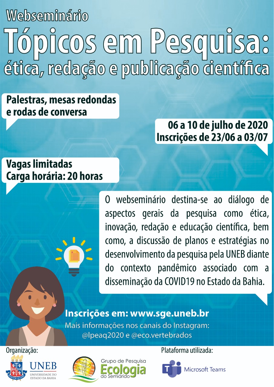 DCHVI Inscrição - 23/06/2020 à 03/07/2020Tópicos em Pesquisa: ética, redação e publicação científica Período de inscrição: 23/06 a 03/07Descrição do evento: o webseminário destina-se ao diálogo de aspectos gerais da pesquisa como ética, inovação, redação e educação científica, bem como, a discussão de planos e estratégias no desenvolvimento da pesquisa pela UNEB diante do contexto pandêmico associado com a disseminação da COVID19 ni Estado da Bahia. Início e término do evento: 06 a 10 de julho Número de vagas: 100 Carga Horária: 20 h
