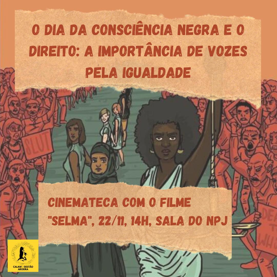 DCHI Inscrição - 17/11/2019 à 22/11/2019A CINEMATECA JURÍDICA apresentará mais um filme que, ao final, contará com um debate! No dia 20/11 se comemora o dia da consciência negra no Brasil. Essa data foi escolhida fazendo referência a morte de Zumbi dos Palmares, uma figura de destaque na luta contra a escravidão e líder do quilombo dos Palmares, sendo instituído feriado em algumas cidades do Brasil desde 2011. Como essa data foi escolhida para relembrar a luta contra a escravidão no Brasil, o CALAW (Centro Acadêmico Luis Alberto Warat) está organizando um evento com a exibição do filme "Selma" e discussão posterior com o professor Sérgio São Bernardo para incentivar a reflexão e o debate sobre esse tema tão importante.
