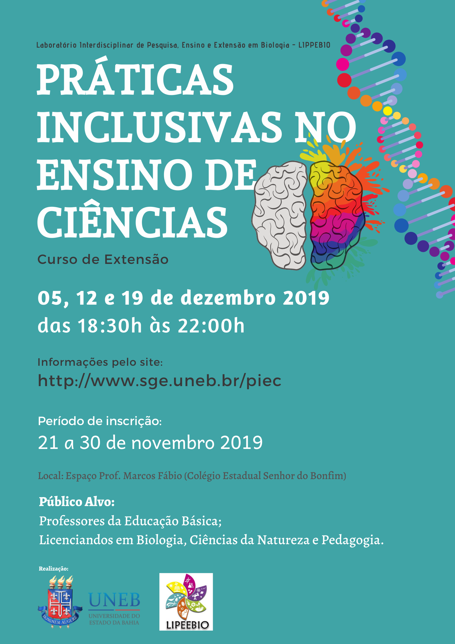 NUPE DEDCVII Inscrição - 21/11/2019 à 05/12/2019O curso de extensão "Práticas Inclusivas no Ensino de Ciências" ocorrerá nas quintas-feiras do mês de dezembro, na cidade de Senhor do Bonfim - BA. O projeto é fruto de uma parceria entre professoras do Laboratório Interdisciplinar de Pesquisa, Ensino e Extensão em Biologia (LIPPEBIO) do Departamento de Educação (DEDC) do Campus VII da UNEB e o Núcleo de Educação Inclusiva da UNIVASF. Na perspectiva de fortalecimento das políticas inclusivas na Educação Básica e nos fundamentos teóricos metodológicos da educação em direitos humanos, o objetivo do curso é possibilitar um espaço de discussão e reflexão sobre a atuação inclusiva do professor de Ciências/Biologia. Entendemos que para uma educação de qualidade todos devem ter direito à construção da aprendizagem. A programação conta com palestras, atividades de planejamento e rodas de conversa sobre experiências com a inclusão na Educação Básica. As atividades serão ministradas pelas professoras Rafaela Rocha de Oliveira e Kelly Meneses Fernandes, no Espaço Prof. Marcos Fábio Oliveira Marques, no Colégio Estadual Senhor do Bonfim. O curso será ministrado em três encontros: 05/12/2019: Noções de normalidade e a educação inclusiva. 12/12/2019: Um ensino de Ciências e Biologia para todos: caminhos para a superação do preconceito racial. 19/12/2019: Possibilidades para uma prática inclusiva no ensino de Ciências. Estão sendo disponibilizadas 30 vagas e é necessário realizar a inscrição prévia.