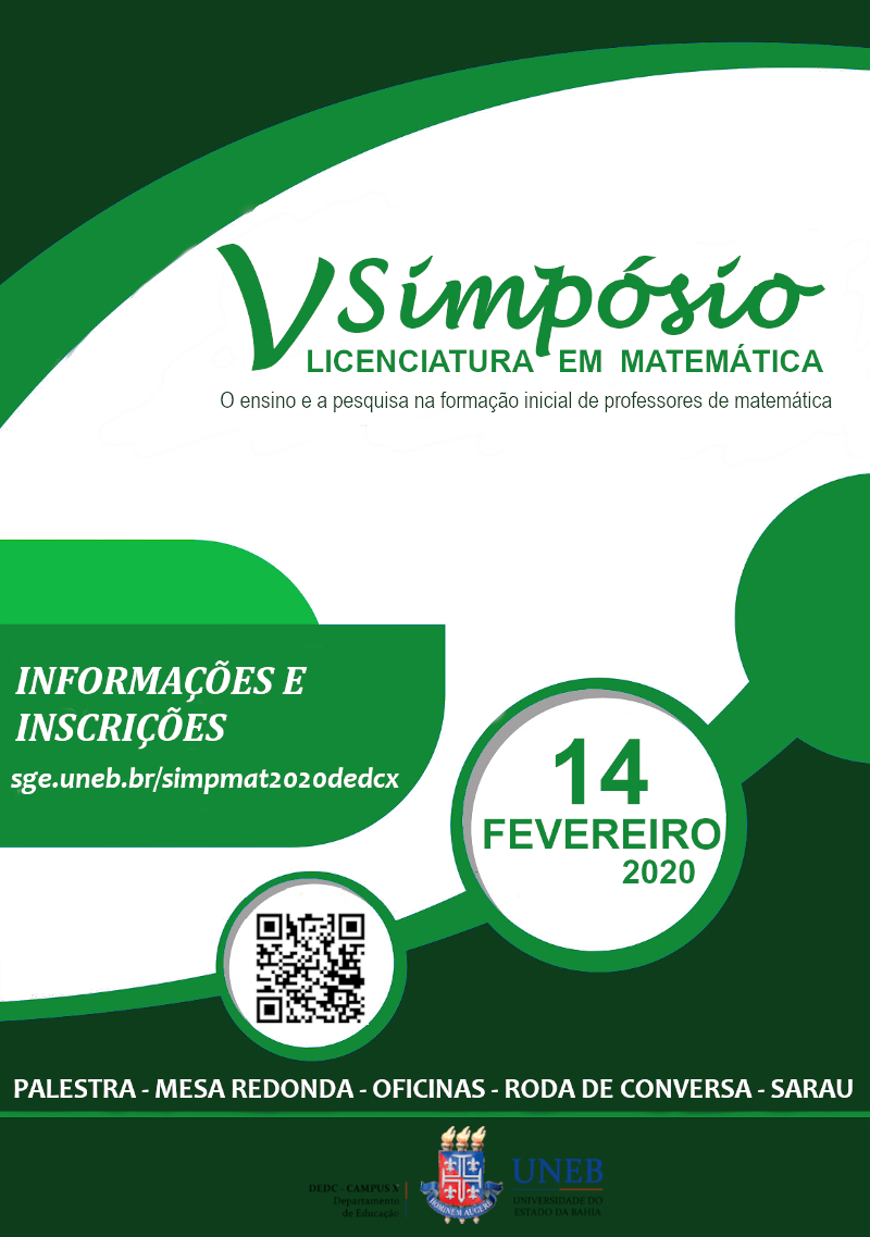 DEDCX Inscrição - 06/12/2019 à 14/02/2020No dia 14 de fevereiro de 2020, o Colegiado de Matemática da Universidade do Estado da Bahia, Departamento de Educação, Campus X, com o apoio da direção departamental, promoverá o V Simpósio de Matemática (V SIMPMAT). O evento busca propiciar um momento de discussão e reflexão sobre a importância da pesquisa na formação de futuros professores de Matemática. Com o V SIMPMAT, buscaremos promover a ideia de pesquisa como componente necessário ao trabalho e à formação de professores. A pesquisa está presente em obras de inúmeros estudiosos da educação e já aparece em leis, projetos e planos governamentais. Por acreditarmos que é possível articular o ensino, a pesquisa e a prática no trabalho e na formação de futuros professores de Matemática é que surgiu a temática deste simpósio. Assim, pretendemos com isso, fomentar um espaço de discussão e reflexões em busca da construção do conhecimento do professor formador e do futuro professor de matemática, por meio das experiências e pesquisas dos professores, alunos e comunidade científica, em especial, no que se refere ao tema. Questões tais: Como vem sendo discutido a pesquisa nos cursos de formação inicial de professores? Pode-se articular o ensino e a pesquisa na formação do futuro professor? De que forma? Como o formador tem lidado com essas questões? Qual a importância da pesquisa para a prática do professor? São objetos de debates e reflexões neste simpósio visando, dessa forma, contribuir com a formação profissional de todos os envolvidos. OBJETIVO GERAL Propiciar um espaço de discussão, debates e reflexões sobre a importância, não só do ensino e aprendizagem da Matemática na formação de futuros professores, mas também trazer à tona discussões e reflexões sobre a pesquisa e a prática docente na formação do professor de Matemática. OBJETIVO ESPECÍFICO Discutir a importância da pesquisa na formação do futuro professor de Matemática. PÚBLICO ALVO Alunos da graduação e professores do Ensino Superior. PROGRAMAÇÃO HORÁRIO ATIVIDADE 7h30min às 8h Credenciamento 8h às 8h30min Cerimônia de Abertura 08h30min às 10h Conferência de Abertura Título: O ensino e a pesquisa na formação do professor Conferencista: Clóvis Lisboa dos Santos Júnior Mediador: Célia Barros Nunes 10h às 10h30min Café Cultural 10h30min às 12h Mesa Redonda 1 Título: A influência da pesquisa na sua prática docente: ouvindo as vozes de alunos egressos do Campus X Composição: Sára Alves de Matos Rodrigues e Rafaela Vicente Costa (Especialistas em Educação Matemática) Mediador: Tânia Maria Boschi 12h às 14h Intervalo 14h às 18h Oficina 1 Tema: Formatação de Trabalhos Acadêmicos Responsáveis: Tatiana Dias Silva, Hávila Said Silva Evangelista e Thaís Santos Pereira Local: Laboratório de Matemática Oficina 2 Tema: Elaboração e formatação de artigo científico Responsável: Aline Santos de Brito Nascimento Local: Laboratório de Informática (CPD) Oficina 3 Tema: O ensino de frações para pessoas surdas na educação: a ludicidade como ferramenta de trabalho Responsáveis: Cristiane Gomes Ferreira, João Vitor Silva de Oliveira, Sinoélia Silva Pessoa, Tânia Maria Boschi e Yasmim Soares Dias Local: Sala 01, pavilhão 01 18h às 19h Intervalo 19h às 20h30min Mesa Redonda 2 Título: A influência da pesquisa na sua prática docente: ouvindo as vozes de alunos egressos do Campus X Composição: Jéssica Milena (Especialista em Educação Matemática) e Lincoln Ferreira Nunes (Mestrado em Profmat) Mediador: Francis Miller Barbosa Moreira 20h30min às 21:30h Roda de Conversa Título: A pesquisa como parte essencial na formação de futuros professores. Composição: Isadora Dias Mariano de Oliveira, João Vítor Silva de Oliveira e Tardelli de Souza Guilherme Mediador: Tatiana Dias Silva 21:30h às 22h30min Sarau da Matemática COMISSÃO ORGANIZADORA Célia Barros Nunes Tatiana Dias Silva COMISSÃO ORGANIZADORA DO SARAU Francis Miller Barbosa Moreira João Vitor Silva de Oliveira Marine Viana Vargens Thefany Hellen Souza Rodrigues MONITORES Angela Almeida Pinheiro Hávila Said Silva Evangelista Isadora Dias Mariano de Oliveira João Vitor Silva de Oliveira Marine Viana Vargens Taciara de Jesus Dias Tárcis de Souza Santos Yuri Ferreira de Sousa REALIZAÇÃO Universidade do Estado da Bahia – UNEB Departamento de Educação da UNEB, Campus X – DEDC X Colegiado de Matemática da UNEB, Campus X Núcleo SBEM-BA – Teixeira de Freitas APOIO Pró-Reitoria de Extensão – PROEX Núcleo de Pesquisa UNEB, Campus X – NUPEX Secretaria de Educação e Cultura – Teixeira de Freitas Instituto Federal de Educação, Ciência e Tecnologia Baiano, Campus Teixeira de Freitas Universidade Federal do Sul da Bahia – UFSB LOCALIZAÇÃO DO EVENTO Universidade do Estado da Bahia, Departamento de Educação da UNEB, Campus X – DEDC X Avenida Kaikan, s/n, Jardim Caraípe, Teixeira de Freitas – BA CEP 45998-004 CONTATO Colegiado de Matemática Tel: (73) 3291-8300 E-mail: cociencias@gmail.com