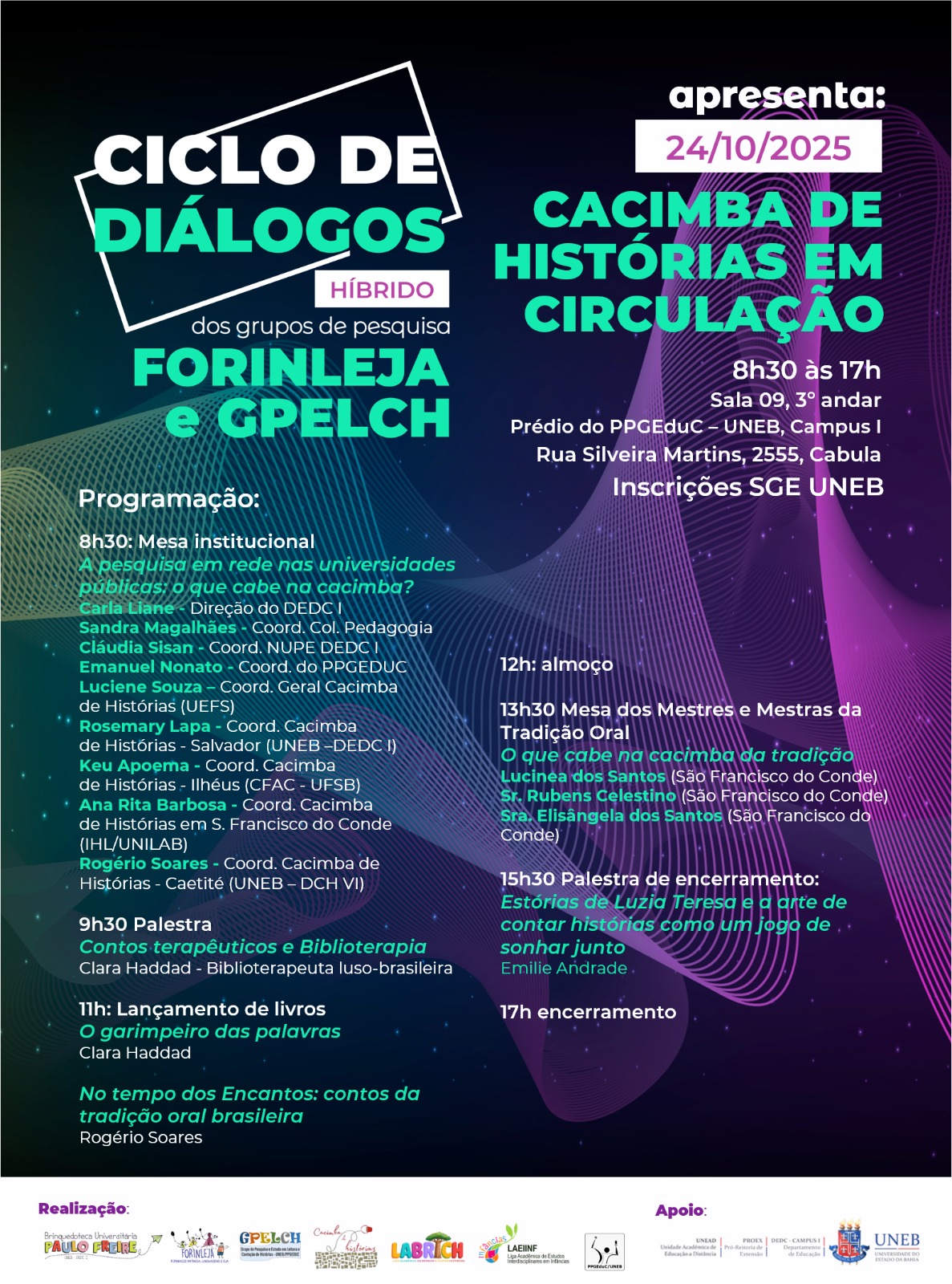 NUPE DEDC I Inscrição - 11/09/2025 à 24/10/2025Os Grupos de Pesquisa FORINLEJA e GPELCH -DEDC/PPGEduC/UNEB, em parceria com a Brinquedoteca Universitária Paulo Freire, LABRICH, e a LAEIINF. realizam o VI CICLO DE DÍALOGOS HÍBRIDO. A Edição de 2025 ocorrerá dia 24/10/2025, às 8:30h ás 17h no Prédio do PPGEDUC, sala 09,Campus I/UNEB, com a temática: Cacimba de Histórias em Circulação. A transmissão será pelo Canal do YOUTUBE do FORMACCEINFÂNCIA UNEB. CERTIFICAÇÃO:10 horas Maiores informações: Instagrans:@rosy.lapa; @formacceinfancia, @brinquedotecapaulofreire E-mail: brinquedotecadedc1@uneb.br Telefone: (71) 9 9604-6166 (Brinquedoteca) Participem!