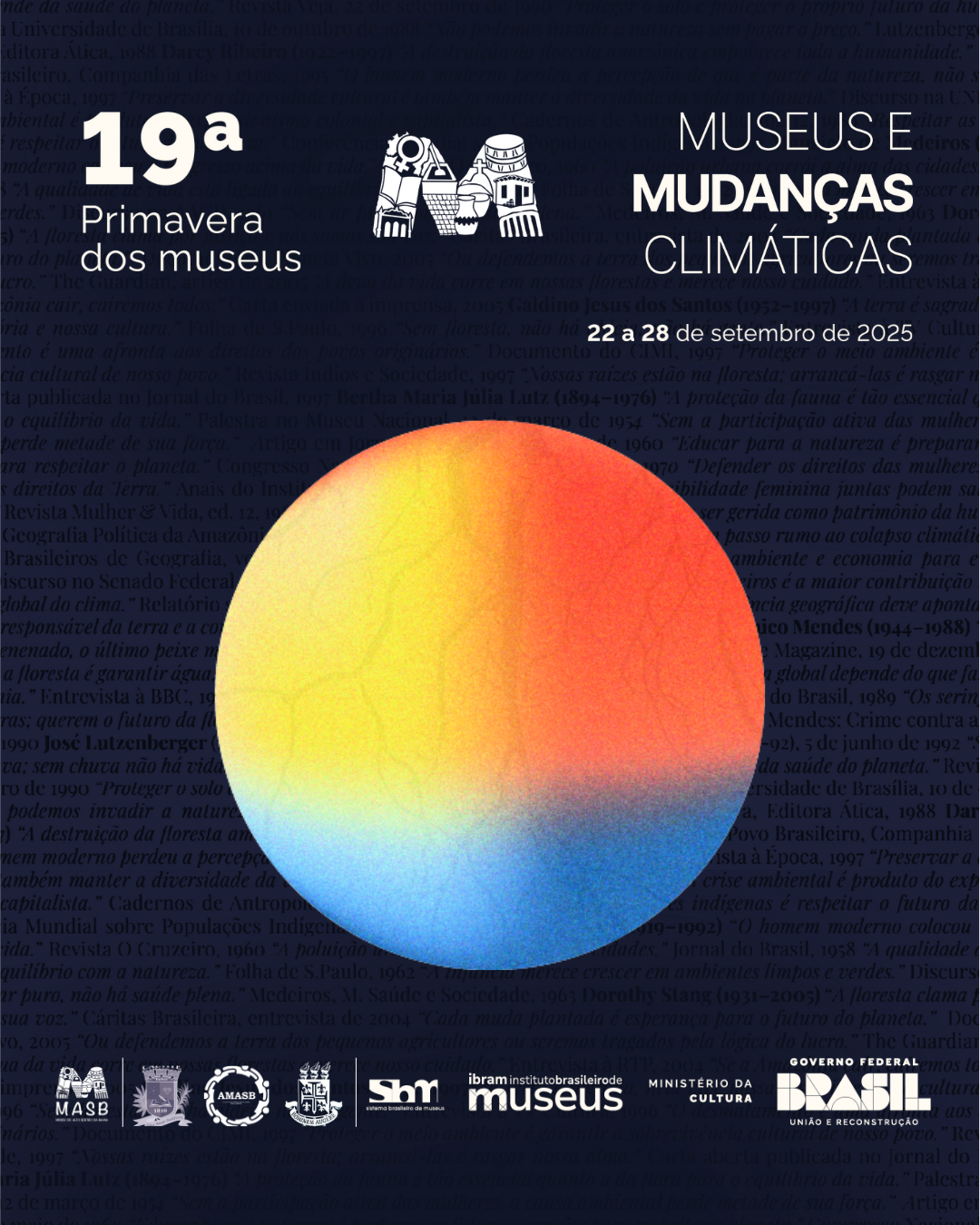 DCHVI Inscrição - 12/09/2025 à 27/09/2025A crise climática deixou de ser ameaça futura e tornou-se realidade, redefinindo paisagens, culturas e modos de vida. Seus efeitos desiguais revelam vulnerabilidades históricas e reforçam a urgência de ações coletivas. Nesse contexto, os museus surgem como atores importantes ao documentar, pesquisar, educar e intervir nos impactos ambientais, conectando memória, justiça e criatividade.. Desse modo, também os museus precisam rever suas próprias práticas, alinhando gestão e sustentabilidade. Seus acervos guardam registros da relação entre sociedades e natureza e podem assumir papel transformador ao estimular debates sobre os desafios climáticos. Assim, o Museu do Alto Sertão da Bahia integra a 19ª Primavera dos Museus com uma programação variada, que tem como objetivo sensibilizar, mobilizar e discutir com as demais instituições como colaborar com a sociedade.