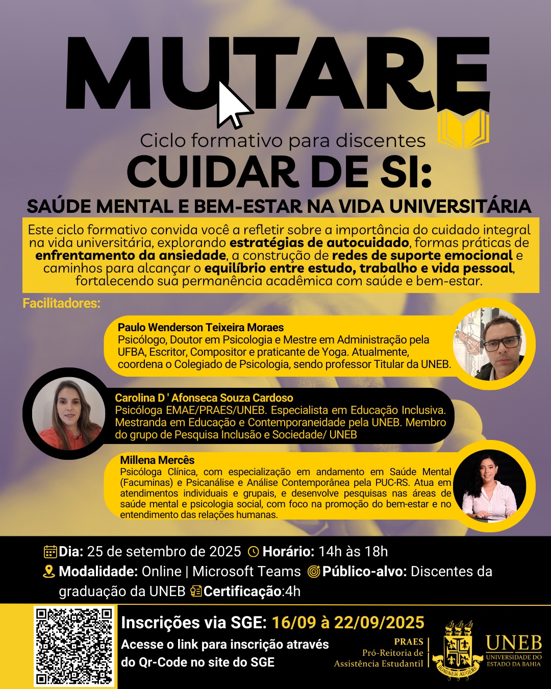 PRAES Inscrição - 16/09/2025 à 22/09/2025Mutare expressa transformação e mudança. Neste sentido, a proposta do projeto pretende se constituir num movimento, num fluxo de mudança e transformações alicerçado na educação como pilar de qualificação, desenvolvimento, aprimoramento de habilidades, competências e saberes do quadro discente da UNEB, a partir de estratégias de formação por ciclos de conhecimento. Estas formações promovidas pela UNEB, por meio da Pró-Reitoria de Assistência Estudantil (PRAES), pretendem dialogar com os pressupostos de desenvolvimento pessoal e o incremento do conhecimento pluriversitário, através de formações certificadas aos/as discentes. A edição do mês de setembro do Mutare - Ciclo Formativo para Discentes, abordará a temática Cuidar de si e saúde mental na vida universitária, no ciclo Convívio e Relações que tem como objetivo dialogar sobre estratégias de de autocuidado, enfrentamento da ansiedade, suporte emocional e equilíbrio entre estudo, trabalho e vida pessoal. A saúde mental é um importante pilar na vida de cada individuo e influencia no aprendizado, na tomada de decisões, nas relações interpessoais e na qualidade da experiência acadêmica. O evento terá a carga horária total de 4 horas, na data de 25/09/2025 a ser realizada em uma oficina no horário de 14h ás 18h. A emissão do certificado está condicionada a participação na carga horaria integral. A oficina do dia 25/09/2025 terá como facilitadores: CAROLINA D'AFONSECA SOUZA CARDOSO: Psicóloga EMAE/ PRAES/ UNEB. Especialista em Educação Inclusiva. Mestranda em Educação e Contemporaneidade pela UNEB. Membro do grupo de Pesquisa Inclusão e Sociedade/ UNEB PAULO WENDERSON TEIXEIRA MORAES Psicólogo, Doutor em Psicologia e Mestre em Administração pela UFBA. Escritor, Compositor e praticante de Yoga. Atualmente, coordena o Colegiado de Psicologia, sendo professor Titular da UNEB. MILLENA MERCÊS Psicóloga Clínica, com especialização em andamento em Saúde Mental (Facuminas) e Psicanálise e Análise Contemporânea pela PUC-RS. Atua em atendimentos individuais e grupais, e desenvolve pesquisas nas áreas de saúde mental e psicologia social, com foco na promoção do bem-estar e no entendimento das relações humanas.