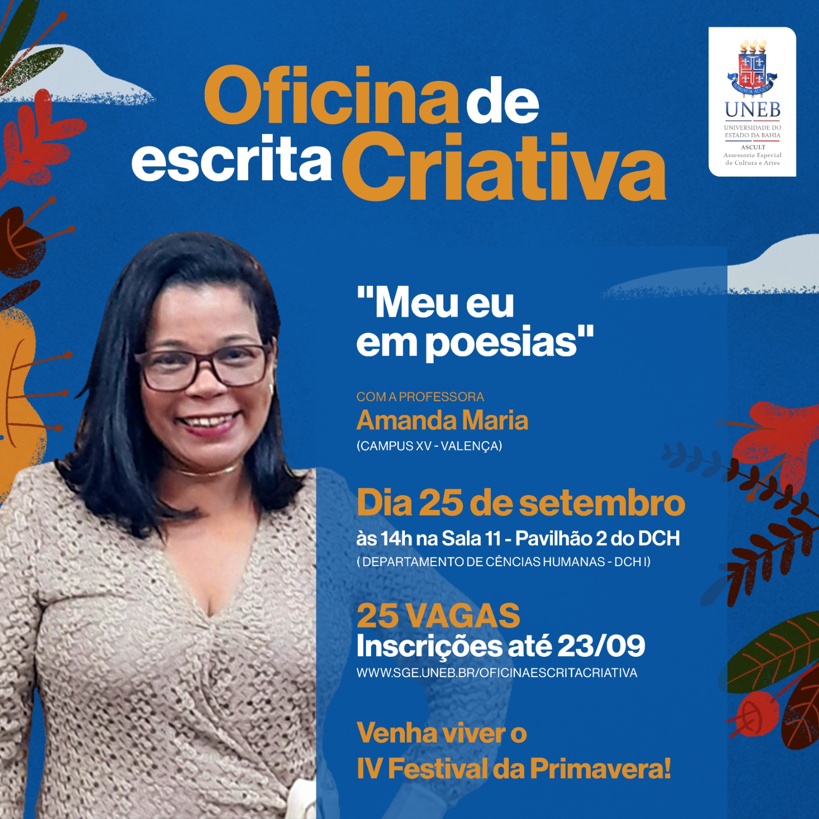 ASCULT Inscrição - 13/09/2025 à 24/09/2025Oficina de Escrita Criativa "Meu eu em poesias" Amanda Maria é professora da área de Letras na Universidade do Estado da Bahia (UNEB/Campus XV/ Valença), onde coordena o curso de Extensão “Estratégias de Leitura para a Compreensão do Texto Literário”. É escritora, já publicou 3 livros, organizou 2 coletâneas e participou como autora de mais de 20 coletâneas. O Objetivo da oficina é proporcionar um momento de reflexão a partir da experiência poética da escrita de si.