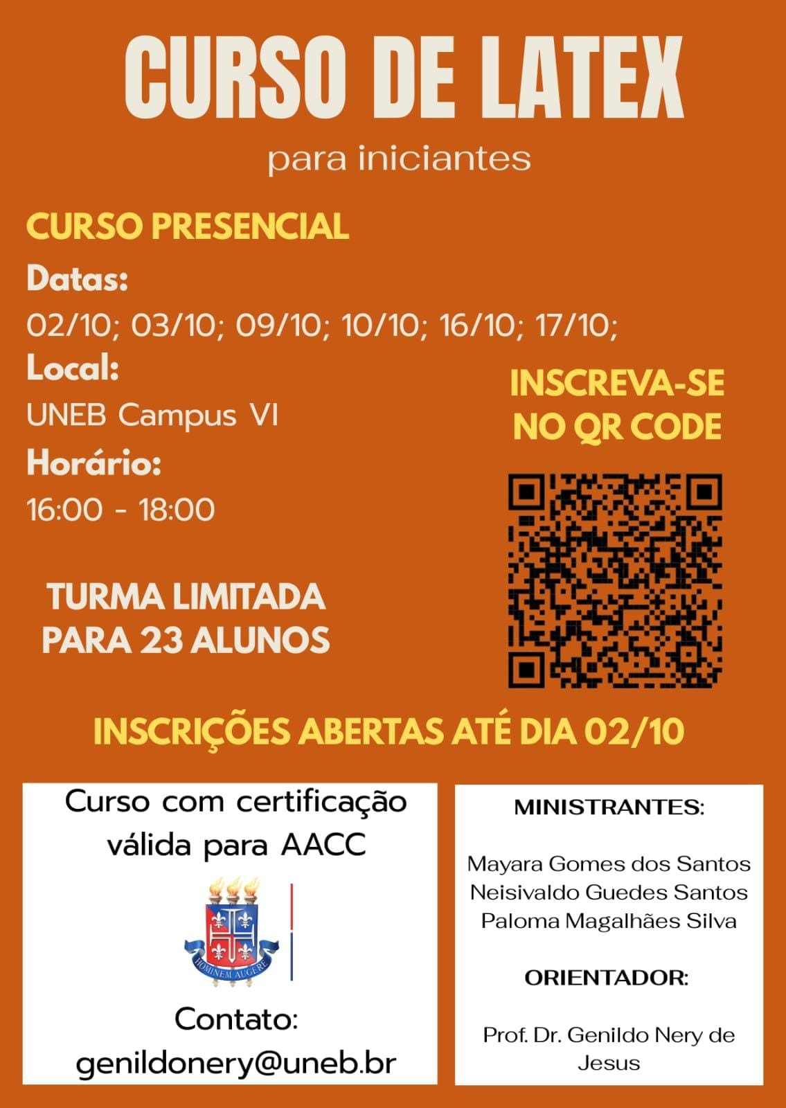 DCHVI Inscrição - 10/09/2025 à 02/10/2025O curso tem como objetivo apresentar os principais comandos e funcionalidades do LaTeX, proporcionando aos participantes autonomia na elaboração de trabalhos acadêmicos, artigos, relatórios e outros documentos científicos de forma organizada e profissional.