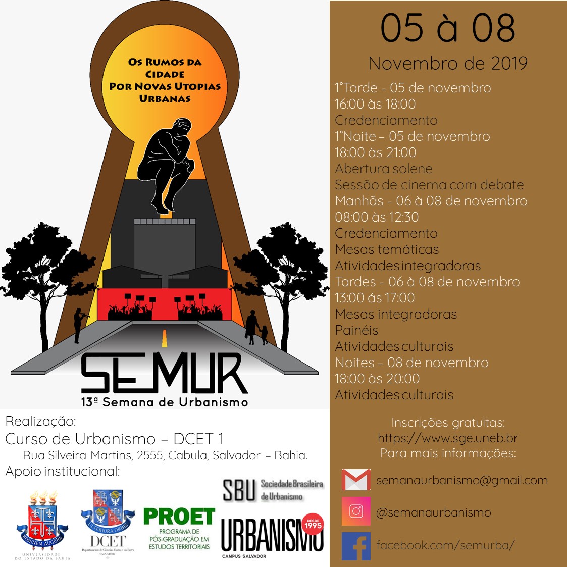 DCETI Inscrição - 25/10/2019 à 08/11/2019A Semana de Urbanismo (SEMUR) é um evento de caráter acadêmico e natureza extensionista, que promove discussões e reflexões sobre as diversas problemáticas inseridas no meio urbano com uma linguagem interdisciplinar envolvendo as áreas das humanidades e das ciências sociais aplicadas. Acontece regularmente em ciclo anual no mês de novembro, para a celebração do dia Internacional do Urbanista sendo esse último celebrado no dia 08. Têm um público alvo diversificado, sendo de antemão o foco principal os discentes, docentes e egressos vinculados ao curso. Contudo entende-se que o planejamento e gestão urbanos necessitam de uma ampla abordagem entre outros profissionais tais como, arquitetos, antropólogos, economistas, geógrafos, sociólogos, entre outros, os quais são convidados a participarem do evento bem como os estudantes desses cursos em outras Universidades localizadas em Salvador e no país, gestores vinculados a órgãos estaduais e municipais, membros de associação de moradores e lideranças de bairro, comunidades socialmente excluídas e pessoas de modo geral que tenham interesse e/ou atuação na área, quer seja de maneira formal ou informal. Nessa décima terceira edição, o evento ganha um novo formato o de “Desconferência” que visa a promoção de uma maior interação entre os participantes na construção dos debates a serem propostos, retirando-os do lugar de meros ouvintes e provocando-os a compartilhar suas próprias experiências, reconhecendo-os como agentes produtores do espaço urbano e inseridos dentro de uma complexa rede de relações interseccionadas nos aspectos etnográficos, de gênero, renda e diversidade sexual e comportamental. A formatação promove também uma maior aproximação através de uma formalidade menos rígida, visando romper o estigma da inacessibilidade da participação popular de eventos promovidos por entidades acadêmicas, reconfigurando desde a inscrição e divulgação do evento – em formato viral; através das redes sociais oficiais do evento no Facebook; e de maneira performática indo nas instituições de ensino - até a organização espacial das salas e o horário das atividades – concentrando-as no turno da manhã e da tarde – visando possibilitar uma maior acessibilidade ao evento. O evento desse ano tem como principal tema: “Os rumos da cidade – Por novas utopias urbanas”; distribuindo-se em três eixos temáticos: “Autonomia popular e poder local”; “Labor e a produção do espaço urbano”; “Inclusão e justiça social”. As discussões serão desdobradas durante os 05 dias de evento, com a conferência de abertura sendo realizada pela noite. As mesas de debate serão distribuídas nos demais dias concentrando-se no turno matutino.