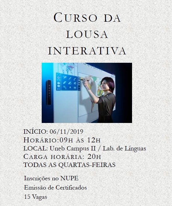 DEDCII Inscrição - 01/11/2019 à 05/11/2019O presente curso de caráter extensionista, busca oferecer a comunidade interessada em aperfeiçoamento no uso de Lousa Eletronica. A comunidade está convidada e teremos o início com 01 turma com 15 (quinze) vagas, a serem ministradas no Laboratório de Língua da UNEB – Campus II – Alagoinhas .A metodologia seguirá com aulas práticas e teóricas de natureza dialógico-discursivas. tendo uma carga horária total de 20 horas/aulas, presenciais. OBJETIVOS ESPECÍFICOS - Apresentar o equipamento (LDI) ; - Discutir o uso do equipamento, relacionando : aplicação e possibilidade às diversas áreas do conhecimento; - Favorecer aperfeiçoamento e atualização à comunidade interessada na aplicação do equipamento a sua atuação no ambiente de trabalho; Toda a comunidade participante ganhará com tal iniciativa, pois teremos crescimento da capacitação dos participantes, como também a otimização do bem público.