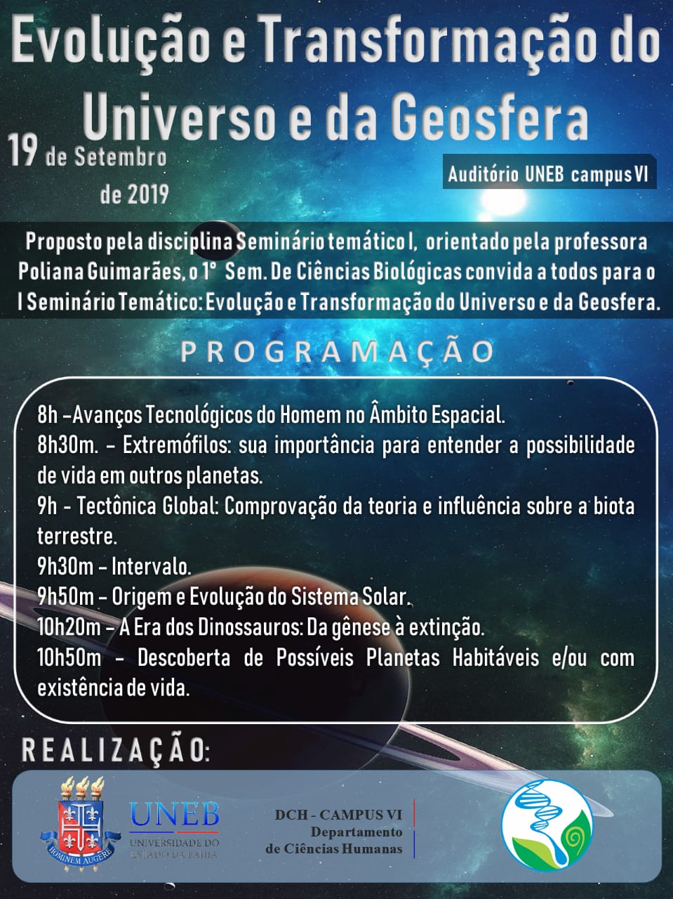 DCHVI Inscrição - 14/09/2019 à 19/09/2019CAMPUS VI PROPOSTO PELA DISCIPLINA SEMINÁRIO TEMÁTICO I, ORIENTADO PELA PROFESSORA POLIANA GUIMARÃES, O PRIMEIRO SEMESTRE DO CURSO DE CIÊNCIAS BIOLÓGICAS CONVIDA A TODOS PARA O PRIMEIRO SEMINÁRIO TEMÁTICO: EVOLUÇÃO E TRANSFORMAÇÃO DO UNIVERSO E DA GEOSFERA.