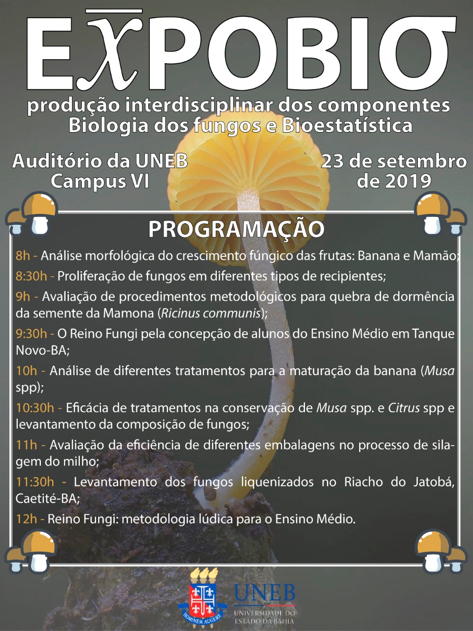 DCHVI Inscrição - 18/09/2019 à 23/09/2019Apresentação de trabalhos de pesquisa desenvolvidos pelos alunos dos componentes Biologia dos Fungos e Bioestatística do curso de Ciências Biológicas, orientados pelas professoras Poliana Guimarães e Thelly Maciel.