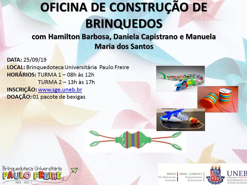 NUPE DEDC I Inscrição - 24/09/2019 à 25/09/2019OFICINA DE CONSTRUÇÃO DE BRINQUEDOS com Hamilton Barbosa, Daniela Capistrano e Manuela Maria dos Santos DATA: 25/09/19 LOCAL: Brinquedoteca Universitária Paulo Freire DEDC I/UNEB HORÁRIOS: TURMA 1 – 08h às 12h TURMA 2 – 13h às 17h INSCRIÇÃO: www.sge.uneb.br DOAÇÃO: 01 pacote de bexigas Maiores informações: 3117-5397/ brinquedotecadedc1@gmail.com