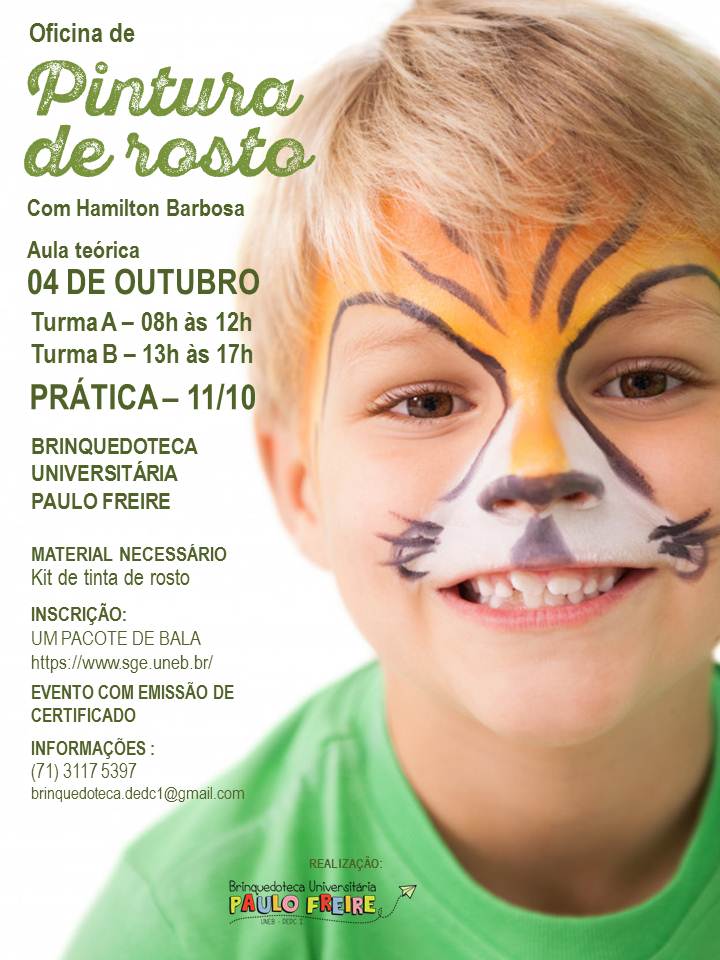 NUPE DEDC I Inscrição - 01/10/2019 à 04/10/2019OFICINA DE PINTURA DE ROSTO Com Hamilton Barbosa Atividade do CIRCUITO FORMATIVO ENSINO APRENDIZAGEM DA BRINQUEDOTECA UNIVERSITÁRIA PAULO FREIRE 04/10 - AULA TEÓRICA/PRÁTICA 11/10 - AULA PRÁTICA com crianças na UNEBrinque - Semana da Criança da Brinquedoteca Universitária Paulo Freire TURMA A: 08h às 12h TURMA B: 13h às 17h MATERIAL NECESSÁRIO: 01 KIT DE PINTURA DE ROSTO INSCRIÇÃO: 01 PACOTE DE BALA