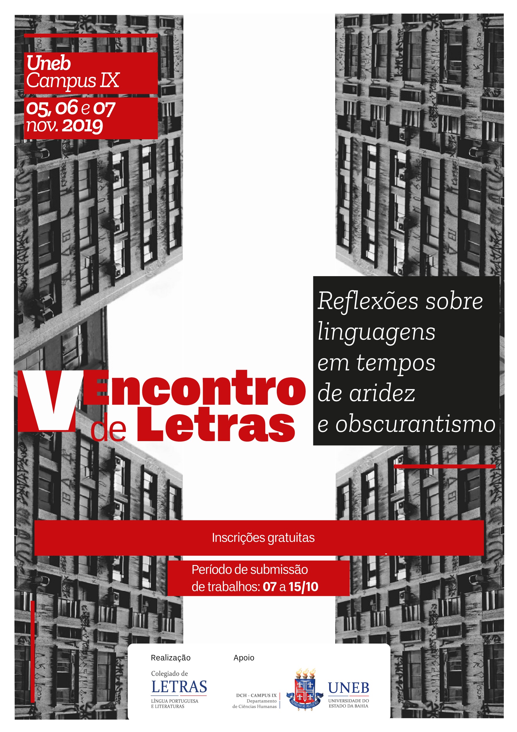 Catedra Inscrição - 07/10/2019 à 20/10/2019A quinta edição do Encontro de Letras da Universidade do Estado da Bahia (UNEB), campus IX, buscará refletir sobre como os cenários nacional, de aridez e obscurantismo intelectuais, e estadual, de descaso e desrespeito com o ensino gratuito, podem impactar na formação do profissional de Letras, criando demandas no processo formativo e na atuação desse profissional. Durante o evento, serão realizadas reflexões, provocadas inquietações, compartilhadas experiências de pesquisa e docência realizadas no campus e também por egressos e participantes de outras instituições. O intuito é criar um espaço de diálogo que nos permita refletir sobre o atual cenário, mas também de acolhimento, para que coletivamente pensemos em modos de resistir ao ódio, ao atraso e à barbárie.