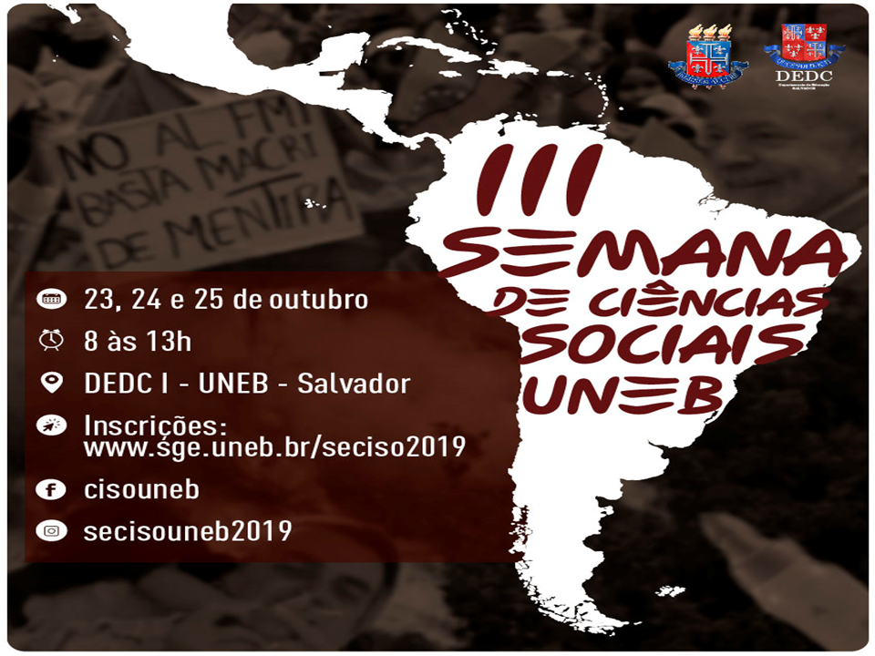 DEDCXI Inscrição - 16/09/2019 à 09/11/2019O II SIPEGEO e a SEMANA DE GEOGRAFIA 2019 a serem realizados conjuntamente de 06 a 09 de novembro de 2019, no Departamento de Educação – Campus XI, da Universidade do Estado da Bahia – UNEB, visam discutir os desafios teóricos e políticos à atuação de geógrafos(as) e educadores(as) quanto à necessária atualização e constante reformulação dos conhecimentos, práticas e saberes geográficos, aproximando o fazer científico da universidade aos conteúdos, experiências e práticas da educação básica. Este evento tem como público-alvo estudantes, professores(as), pesquisadores(as) e comunidade em geral. Contempla a atualização das perspectivas epistemológicas, teóricas e metodológicas da ciência geográfica considerando, por um lado, os avanços do conhecimento, de modo geral, e por outro, os cenários sociopolítico e cultural adversos ao desenvolvimento científico e educacional. São cenários de cerceamento da liberdade de pensamento e expressão, difusão de concepções retrógradas e anticientíficas, bem como a significativa restrição dos investimentos públicos em ciência, educação e cultura. Ademais, verifica-se o avanço de uma ordem global ainda mais complexa e desigual, o acirramento de conflitos geopolíticos e guerras comerciais, a permanente instabilidade no panorama econômico mundial, imigrantes que fogem da miséria e da violência em todos os continentes e aumento da intolerância, do racismo e da exclusão. Associados a esses graves problemas tem-se ainda a dilapidação dos direitos sociais, as ameaças às comunidades tradicionais, no Brasil e em diversos países e o drástico agravamento da crise ambiental, em escalas regional, nacional e planetária. Nesse contexto, cabe aos profissionais e estudantes de Geografia o necessário aprofundamento dos debates em torno do tema central do evento: GEOGRAFIA, EDUCAÇÃO E SOCIEDADES CONTEMPORÂNEAS: DESAFIOS TEÓRICOS E EMBATES POLÍTICOS de modo a construirmos coletivamente outros horizontes de pensamento e ação para os enfrentamentos da contemporaneidade. Essa é a visão e proposta do II SIPEGEO e da SEMANA DE GEOGRAFIA 2019. COMISSÃO ORGANIZADORA COORDENAÇÃO GERAL: Rogério Macedo e Renato Léda COMUNICAÇÃO: Luiza Cristina Silva Silva, Simone Santos de Oliveira, Bruno Leonardo Castro e Juliana Melo Leite (Núcleo de Comunicação/DEDC). PROGRAMAÇÃO Luiza Silva, Ivan dos Reis Cardoso, Lorena Ferreira de Souza Almeida, Macário Protázio Costa Jr. FINANCEIRO: Josianne Lima, Jean da Silva Santos, Jucélia Macêdo, Bruno Trabuco (Coordenação Financeira/DEDC) COMISSÃO CIENTÍFICA: Marize Damiana Batista, Jussara Fraga Portugal e Nélia Monteiro (NUPE) Pareceristas: todos os professores do Colegiado de Geografia COMIISSÃO CULTURAL: Discentes Dilmara Menezes, Caio Santos, Alan Barbosa Barros, Noêmia dos Santos Silva, Vanessa Brito. DIRETÓRIO ACADÊMICO DE GEOGRAFIA Alan Barbosa Barros; Caio Santos Rodrigues; Clécia Nery da Silva Santos; Diego Calçada Rigaud Félix; Dilmara Menezes Santos; Malena Barroso dos Santos Ribeiro; Noêmia dos Santos Silva; Vanessa Luciano Brito.