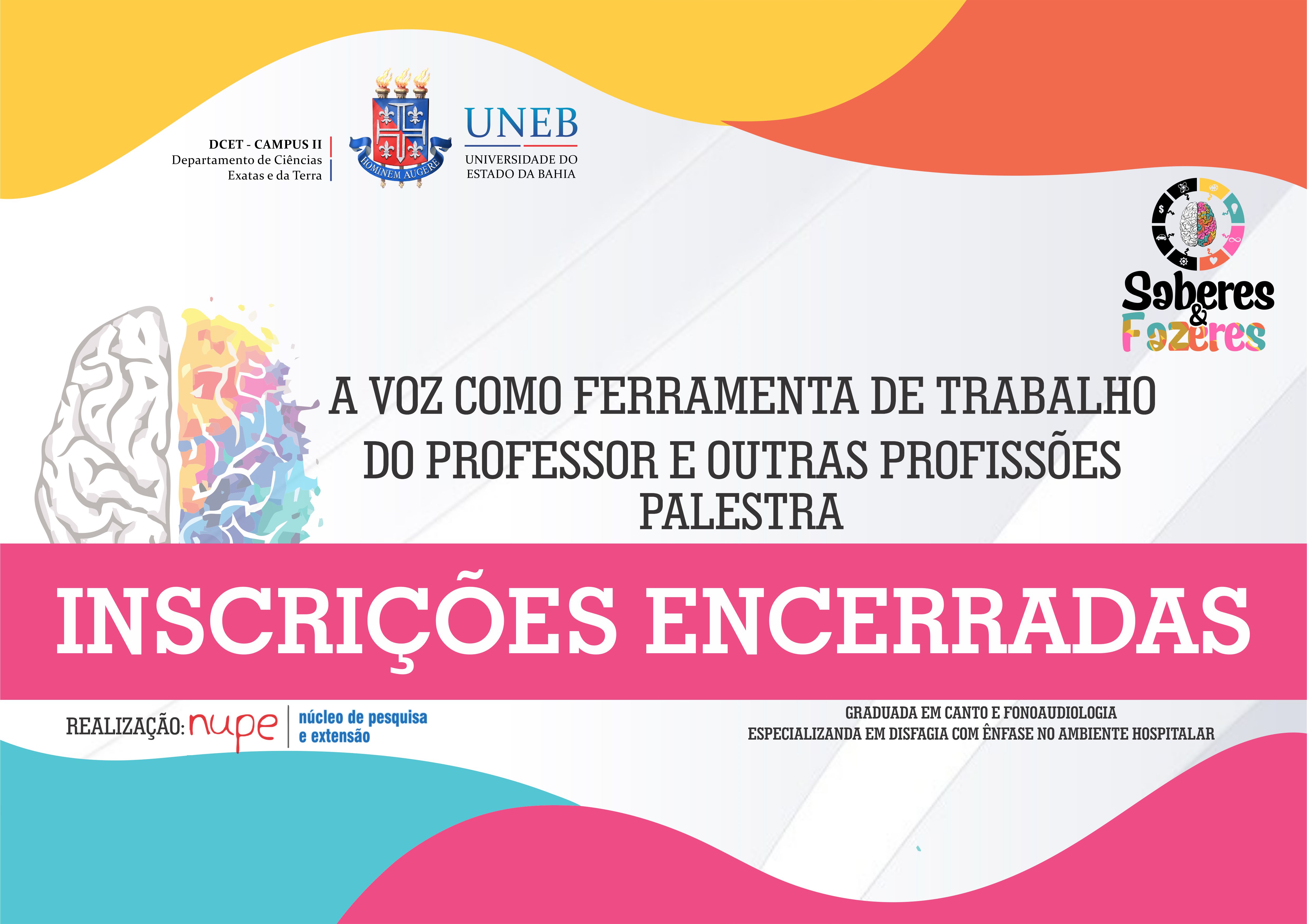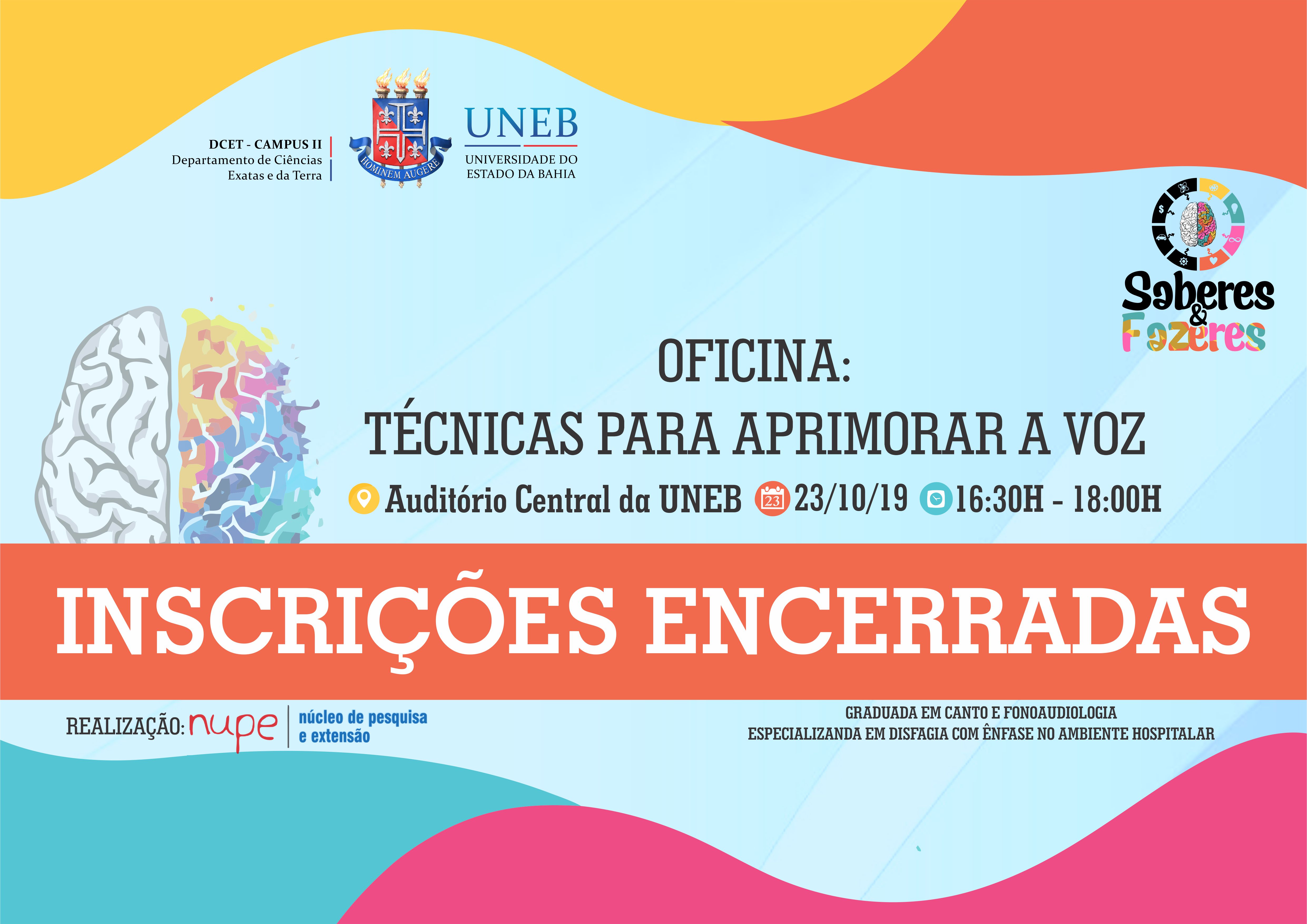 NUPE DCETII Inscrição - 01/10/2019 à 22/10/2019Saberes & Fazeres “Saberes & Fazeres”, nome que homenageia as Comunidades Quilombolas da Barra e do Bananal, pertencentes ao município de Rio de Contas, na Bahia. Após mais de 3 séculos de deterioração cultural provocada pela colonização, as comunidades quilombolas de Rio de Contas criaram a cooperativa Saberes & Fazeres, para recuperar e resignificar parte da sua cultura perdida. Tomando o seu nome como empréstimo-homenagem, o Saberes & Fazeres pretende revelar os projetos de pesquisa, ensino e de extensão desenvolvidos pela UNEB de Alagoinhas e também de suas parcerias. Seguindo a tópica do Café & Sal, nosso evento de aproximação à divulgação científica , o Saberes & Fazeres trará palestras e oficinas de cunho prático, direcionada ao público das nossas licenciaturas, bem como seus egressos, para que a audiência vivencie em primeira pessoa como o conhecimento trabalha para o nosso benefício. Desde como a matemática pode ser simplificada, a entender como fungos e bactérias podem ser nossos aliados, bem como o conhecimento de quilombolas, pescadores e agricultores familiares tem salvado vidas. Pelo seu caráter técnico, participativo e prático, a estrutura do evento está pensada para abrigar uma palestra interativa, aberta para o máximo de 60 pessoas, seguida de uma oficina destinada a 40 pessoas. Mais uma vez: é da Universidade para a Sociedade!!! PROGRAMAÇÃO COMPLETA DO EVENTO