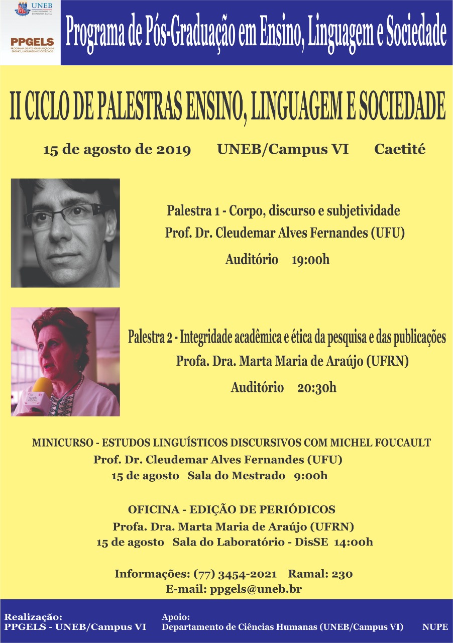 DCHVI Inscrição - 05/08/2019 à 15/08/2019II CICLO DE PALESTRAS: ENSINO, LINGUAGEM E SOCIEDADE Palestra 1 - Corpo, discurso e subjetividade Prof. Dr. Cleudemar Alves Fernandes (UFU) DIA 15/08/2019 19:00h - Auditório Palestra 2 - Integridade acadêmica e ética da pesquisa e das publicações Profª. Drª Marta Maria de Araújo (UFRN) DIA 15/08/2019 20:30h - Auditório MINICURSO - ESTUDOS LINGUÍSTICOS DISCURSIVOS COM MICHEL FOUCAULT Prof. Dr. Cleudemar Alves Fernandes (UFU) DIA 15/08/2019 9:00h - Sala do Mestrado OFICINA - EDIÇÃO DE PERIÓDICOS Profª. Drª Marta Maria de Araújo DIA 15/08/2019 14:00h Sala do Laboratório - DisSe