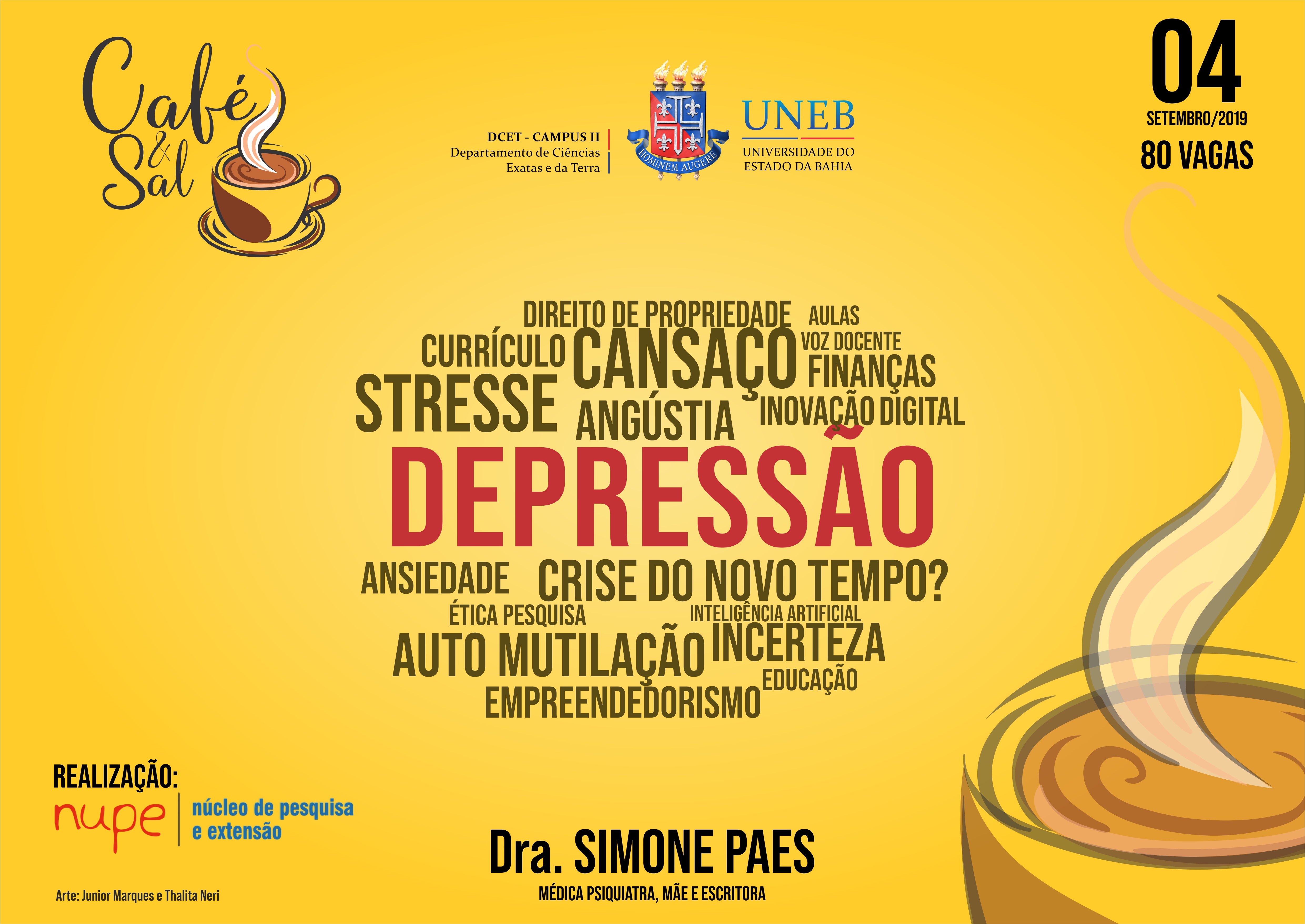 NUPE DCETII Inscrição - 07/08/2019 à 04/09/2019Café & Sal: às quartas na UNEB Café tanto acalma, como acorda ou distrai. O sal, condimenta, conserva e protege os alimentos. Nesta combinação e somatória de elementos tão baianos quanto brasileiros, vamos reunir mensalmente especialistas de áreas diversas em uma conversa que vai nos auxiliar em diferentes aspectos dos desafios do cotidiano, de modo prático e específico, fruto das demandas apresentadas pelo corpo universitário, em vista a socialização e aumento da capilaridade das atividades de pesquisa, ensino e extensão da UNEB para a sociedade de Alagoinhas e região. A estrutura do evento está pensada para abrigar uma palestra interativa nuclear, aberta para o máximo de 100 pessoas, e que será complementada com duas rodas de conversa vivenciais, que ocorreram logo após, um café, com o especialista da vez. Como somos uma Universidade pública, gratuita e de qualidade, o Café & Sal é uma atividade gratuita, da Universidade para a Sociedade.