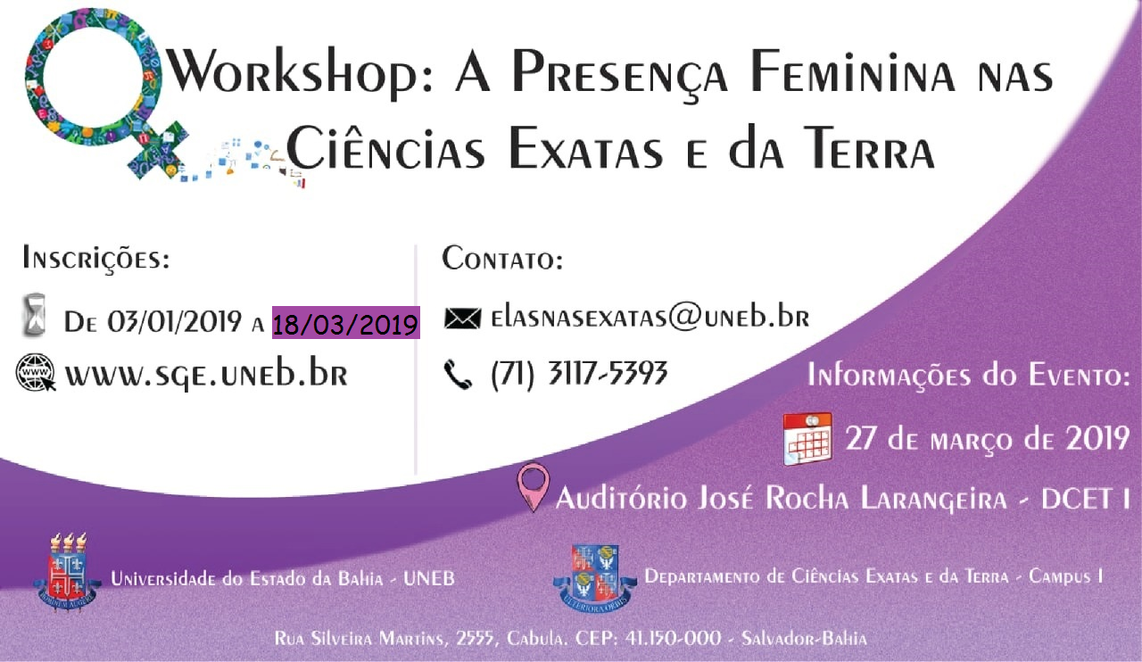 NUPE DCET I Inscrição - 21/03/2019 à 26/03/2019Confrontando o universo feminino e as ciências exatas A mostra de filmes Confrontando o universo feminino e as ciências exatas é uma atividade integrante do Workshop A presença feminina nas ciências exatas e da terra que acontecerá no dia 27.03.2019. A atividade será ministrada pelas discentes Andreia Santos (Engenharia Civil) e Gabriela Mendes (Química) das 15 às 17:30 horas. Com direito a certificado de 2:30 horas. Aguardamos a todas e todos que desejem trocar experiências com profissionais e estudantes da área!