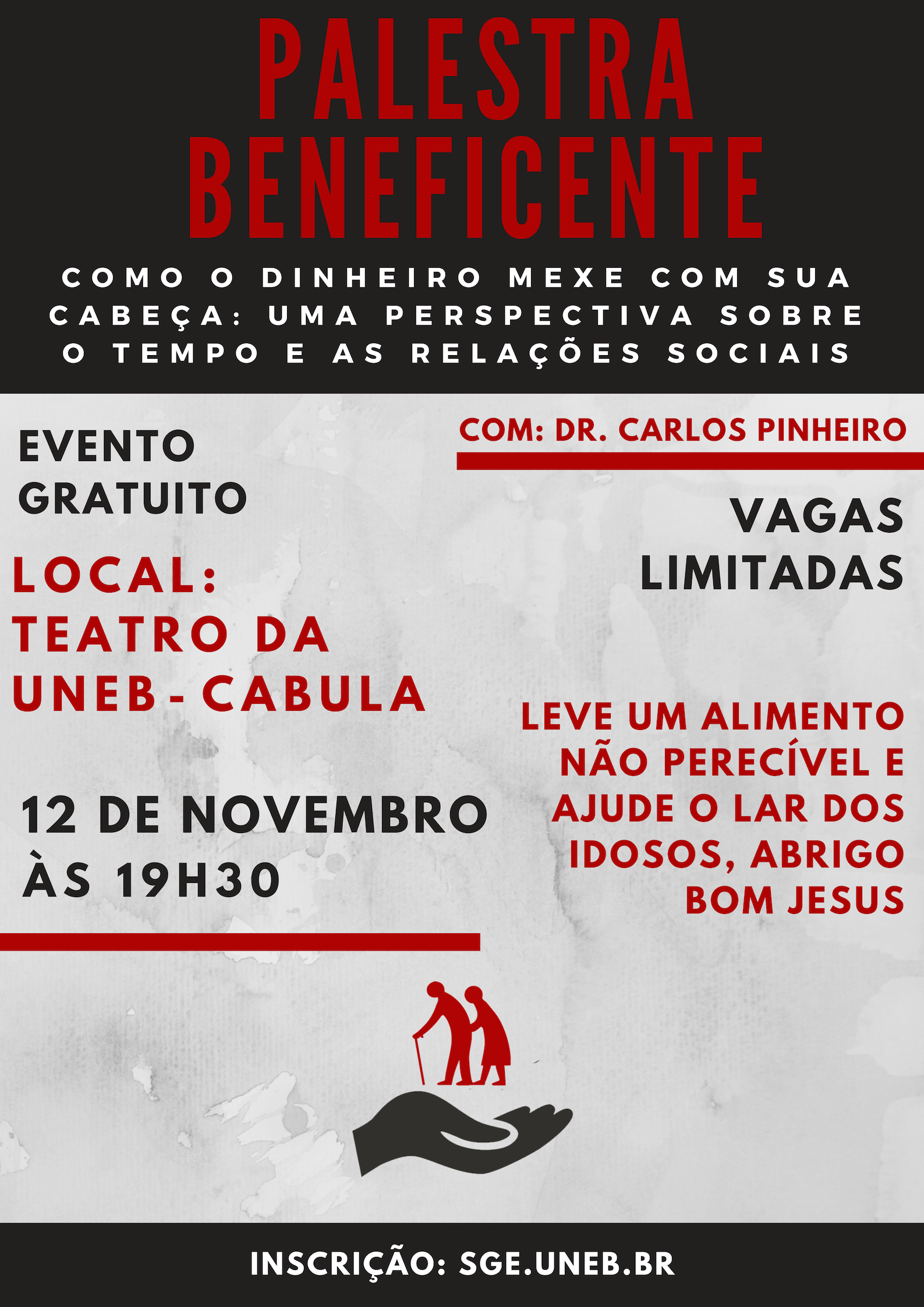 NUPE DCH I Inscrição - 30/10/2018 à 11/11/2018PALESTRA BENEFICENTE – O USO DO DINHEIRO E AS RELAÇÕES SOCIAIS: UMA PERSPECTIVA SOBRE O TEMPO E AS RELAÇÕES SOCIAIS Promovido pelo Departamento de Ciências Humanas (DCH-I) da Universidade do Estado da Bahia (UNEB), Campus I, Salvador, ocorrerá no dia 12 de novembro, às 19:30h, no Teatro UNEB, o evento: “Como o dinheiro mexe com sua cabeça: uma perspectiva sobre o tempo e as relações sociais”. A palestra será ministrada pelo idealizador do evento, prof. Dr. Carlos Pinheiro, escritor e graduado em Administração. As discussões apresentadas no evento envolverão situações em que o tempo e as relações sociais influenciam no autocontrole do indivíduo, interferindo por sua vez, nas finanças. A palestra busca refletir sobre a relação entre a racionalidade e o envolvimento emocional do indivíduo, que impacta diretamente em suas decisões financeiras. O evento é gratuito e beneficente, para participar o interessado deve doar um quilo de alimento não perecível. Os alimentos arrecadados serão integralmente doados para o Lar de Idosos, Abrigo Bom Jesus, fundado em 2006, e responsável, atualmente, por abrigar 158 idosos em estado de vulnerabilidade socioeconômica e de saúde. O palestrante Carlos Pinheiro é graduado em Administração de Empresas, com especialização em Finanças, possui mestrado e doutorado em Modelagem Computacional pelo Centro Universitário SENAI CIMATEC e atua como docente na UNEB. Em seu currículo, conta com a publicação de artigos nacionais e internacionais e é autor dos livros: Tenha Modos com o seu Dinheiro (2009) e Por que não ganhamos na Bolsa de Valores (2010), ambas pela Editora Ciência Moderna. O evento conta com 300 vagas, com carga horária de 4 horas, com certificado. A arrecadação dos alimentos em prol do Abrigo Bom Jesus será realizada no ato de credenciamento, no dia e local do evento. Serviço: O quê: Palestra “Como o dinheiro mexe com sua cabeça: uma perspectiva sobre o tempo e as relações sociais” Quando: 12 de novembro de 2018 (segunda-feira), às 19h30 Onde: Teatro UNEB, Rua Silveira Martins, 2555 – Cabula, Campus I Quanto: Gratuito, com doação de 1kg de alimento não perecível Inscrições: https://www.sge.uneb.br Contato: nupedch1@gmail.com | (71) 3117-2455