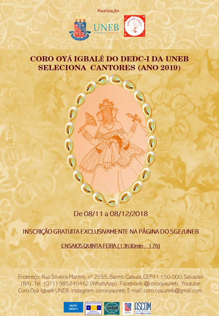 NUPE DEDC I Inscrição - 08/11/2018 à 06/12/2018O CORO OYÁ IGBALÉ SELECIONA NOVOS CANTORES VOLUNTÁRIOS (2019) O Projeto Coro Oyá Igbalé do Departamento de Educação do Campus I da UNEB seleciona 12 cantores voluntários (homens e mulheres) de todos os naipes que serão integrados ao grupo a partir de fevereiro de 2019. As inscrições são gratuitas e podem ser realizadas no período compreendido entre 08/11/2018 e 08/12/2019. A seleção acontecerá nos dias 13 e 14 de Dezembro de 2018, das 14h às 17h na sala 21 do Prédio Multidisciplinar do Campus I da UNEB. A seleção será coordenada pela professora Julice Oliveira; e, realizar-se-á, em três etapas, a saber: análise dos formulários (I etapa), entrevista (II etapa) e audição (III etapa). Os selecionados na primeira etapa terão a possibilidade de participar de oficina de canto para se preparar melhor para a audição. Podem se inscrever pessoas com idade mínima de dezoito anos que fazem parte da comunidade acadêmica da UNEB (professores, alunos e funcionários) e integrantes da comunidade externa, em especial integrantes das comunidades de matriz afro-brasileira (candomblé, quilombo, dentre outras). Os candidatos não precisam ter experiência em canto ou ter participado de outros corais. Os ensaios regulares acontecem sempre às quintas-feiras das 13h30min às 17h. Os ensaios extras e demais atividades nos outros dias da semana. O projeto NÃO paga ajuda de custo, pro labore, bolsa, prêmio em dinheiro ou qualquer tipo remuneração. A inscrição é gratuita e pode ser realizada no Portal UNEB Novo: https://www.sge.uneb.br/ O projeto é vinculado ao Grupo de Estudos em Estética e Contracultura (GEEC). Possui como parceiros institucionais a Direção do Departamento de Educação do Campus I da UNEB, CPDER e ASCOM. Informações: Departamento de Educação da UNEB, Rua Silveira Martins, nº 2555, Bairro: Cabula, CEP 41.150-000, Salvador (BA). Tel: (071) 985240462 (WhatsApp). Facebook: @corooyauneb. Youtube: Coro Oyá Igbalé UNEB. Instagram: @corooyauneb. E-mail: coro.oya.uneb@gmail.com. Página do evento: https://www.facebook.com/events/1754726131304946/