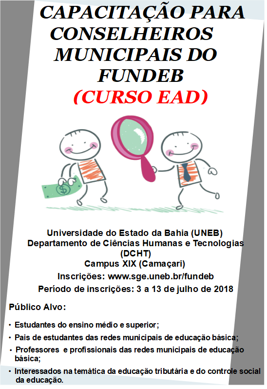 DCHTXIX Inscrição - 03/07/2018 à 14/07/2018O Curso de Capacitação para Conselheiros do Fundeb é um curso com atividades realizadas exclusivamente em EAD na plataforma de aprendizagem virtual (AVA) da Universidade do Estado da Bahia (UNEB) voltado para estudantes, profissionais de educação e demais interessados no controle social dos recursos que financiam a rede pública de educação básica no país. Evidencia os pressupostos históricos e normativos dos fundos contábeis de financiamento da educação pública, contextualizando as categorias financiamento, oferta, gestão educacional e controle social como elementos norteadores da compreensão do papel institucional dos colegiados do Fundeb (CACS-Fundeb) e estabelece diretrizes para uma provável metodologia que planeja, organiza e busca efetivar o trabalho desses conselhos em dimensão que possibilite reposicionar suas práticas em perspectiva de acompanhamento e controle social da legitimidade das políticas públicas educacionais no esforço de superação da dicotomia fiscalização e legalidade que historicamente pautam sua compreensão. É uma iniciativa do grupo de pesquisa Educação, Federalismo e Controle Social (EFeCS) que atua no ensino, pesquisa e extensão acerca dos fenômenos da administração educacional, das políticas públicas educacionais, da educação tributária e do controle social. O curso será realizado no ambiente virtual de aprendizagem (www.campusvirtual.uneb.br) no período de 23 de julho a 23 de agosto de 2018 com carga horária de 20 horas. A partir de 20 de julho de 2018, aguarde mensagem com orientações para início das atividades. As atividades serão realizadas exclusivamente em EAD, assista o vídeo tutorial de acesso ao Ambiente Virtual de Aprendizagem (AVA) após o recebimento de e-mail confirmando cadastro na plataforma. Link do vídeo tutorial de acesso ao Ambiente Virtual de Aprendizagem (AVA) - copie e cole no seu navegador: http://drive.google.com/file/d/1SBZQwqmrVrA5rrOg-UIQHC2zGGior8ra/