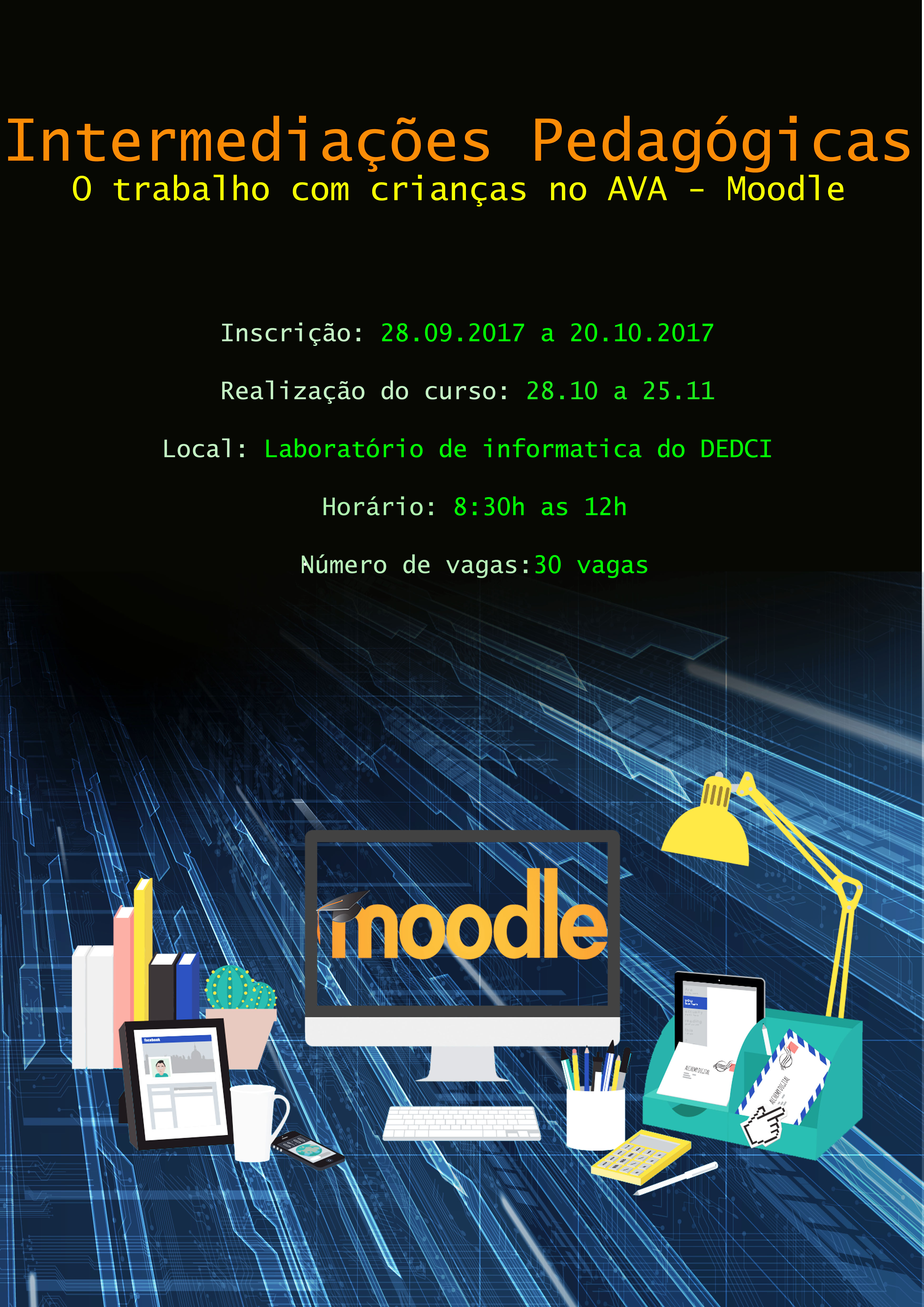 NUPE DEDC I Inscrição - 01/11/2017 à 30/11/2017INTERMEDIAÇÕES PEDAGÓGICAS PARA O TRABALHO COM CRIANÇAS NO AVA - MOODLE O projeto de extensão intitulado Intermediações pedagógicas para o trabalho com crianças no AVA- Moodle, compreende os novos processos de construção do conhecimento e como as crianças interagem com a web, ao estabelecer uma relação de produção, autoria e coautoria. Esse imbricamento, permite que a criança possa pensar sobre a sua aprendizagem, criar seu espaço de aprendizagem, por meio de um processo interativo e colaborativo, no qual, crianças e educadores dialogam entre si, em prol da construção de novos conhecimentos. Tem como objetivo: Formar professores e alunos da graduação para a utilização do Moodle com as crianças nos anos iniciais, potencializando o processo ensino-aprendizagem. Período de realização do curso: 16.12.2017 Local e horário das aulas: Aulas presenciais Laboratório de Informática do DEDCI Horário: 8:30h as 12h Número de vagas: 30 vagas