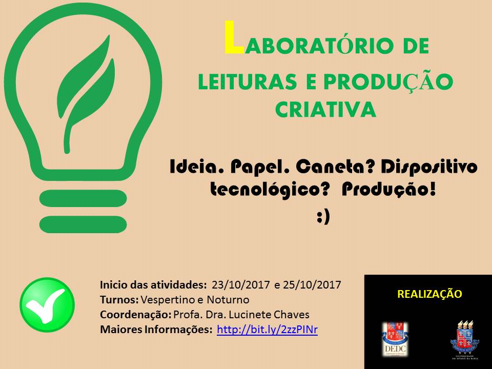 NUPE DEDC I Inscrição - 23/10/2017 à 30/11/2017O Laboratório de Leituras, produção criativa e colaborativa de textos acadêmicos trata-se de um projeto de Extensão, Ensino e de Pesquisa Exploratória sobre a experiência com a escrita colaborativa de estudantes universitários, graduandos do curso de Pedagogia do DEDC – I, com o intuito de ampliar e desenvolver suas experiências com a escrita acadêmica, na perspectiva dos múltiplos letramentos; de contribuir para que se desenvolva a cultura institucional de oferta de espaços e ações que oportunizem essas experiências entrelaçadas ao estudo de conteúdos específicos do projeto curricular. Para a presente proposta elegemos temas relativos à infância, linguagens e educação, em função de necessidades formativas identificadas. Pretende-se o alcance de novas aprendizagens por parte da docente e dos estudantes, com a sistematização e avaliação do trabalho realizado, e por meio de um estudo exploratório sobre a trajetória percorrida e seus resultados, na perspectiva de todos os envolvidos. Tais resultados podem alavancar decisões institucionais quanto ao ensino e aprendizagem da escrita acadêmica na formação de pedagogos, futuros docentes da educação básica, onde persiste a reprodução do analfabetismo funcional. A oferta ocorrerá em dois turnos, a saber: 1) Laboratório de leituras, produção criativa e colaborativa de textos acadêmicos – sobre infância, educação e cuidado em creches e pré-escola (oralidade, escrita, hipermídia); 2) Laboratório de leituras e produção colaborativa de textos acadêmicos – sobre alfabetização, alfabetismos e múltiplos letramentos (oralidade, escrita e hipermídias). Os encontros acontecerão em dois turnos: 1. Inicio: 23/10/2017 Atividade Turno Encontro Dias Horário Vagas Laboratório de Informática Vespertino Presencial Segundas-feira 14hrs às 17hrs 10 Inicio: 25/10/2017 Atividade Turno Encontro Dias Horário Vagas SALA 09 DEDC - I Noturno Presencial Quartas-feira 17hrs às 20hrs 10