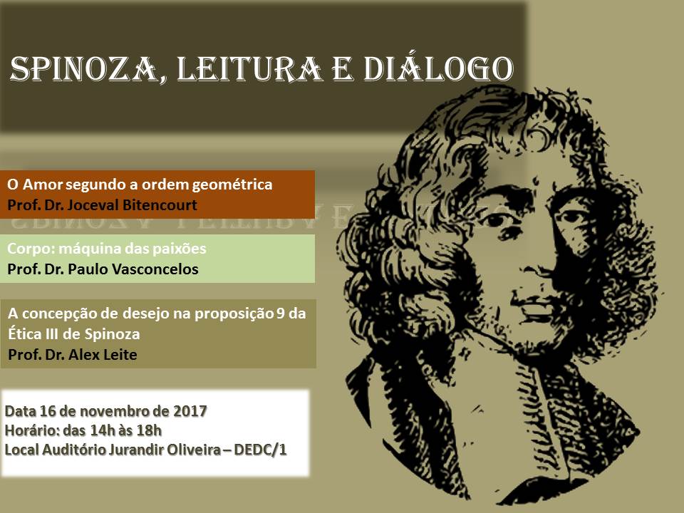 NUPE DEDC I Inscrição - 13/11/2017 à 17/11/2017O evento "Spinoza, Leitura e Diálogo" tem como objetivo findar discussões em torno da unidade entre corpo e mente, valorados pelo grande filósofo Spinoza. O tema propõe dois pontos de partida para a construção do conhecimento relativo ao tema, a saber: 1. o que pode haver entre a equivalência sem causalidade; 2. Somente há causalidade entre coisas da mesma natureza que se relacionam. Desse modo, o objetivo do evento é convidar a comunidade acadêmica para pensar os desdobramentos relativos ao corpo e mente, foco do livro IV "Ética de Spinoza". Programação Palestra: "O amor segundo a ordem geométrica. Professor Dr. Joceval Bitencourt Palestra: "Corpo: máquina de paixões" Prof. Dr. Paulo Vasconcelos Palestra: "A concepção de desejo na Proposição 9 da Ética III de Spinoza" Prof. Dr. Alex Leite