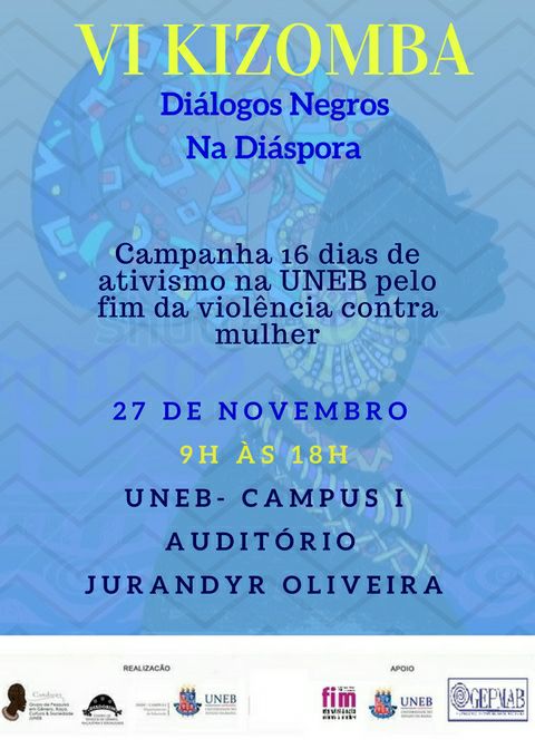 NUPE DEDC I Inscrição - 13/11/2017 à 28/11/2017VI KIZOMBA Diálogos Negros na Diáspora- Campanha 16 dias de ativismo na UNEB pelo fim da violência contra mulher UNEB, SALVADOR, DEPARTAMENTO DE EDUCAÇÃO – I 27 DE NOVEMBRO DE 2017 8:30 às 19H O KIZOMBA é um Evento do Departamento de Educação, da Universidade do Estado da Bahia- UNEB, Campus –I, Salvador. Este evento tem como objetivo debater temas relacionados ao mês da Consciência Negra, homenageando a Imortalidade de Zumbi dos Palmares, grande líder negro da América, que ao lado de grandes mulheres negras, Acotirene e Dandara, ecoou o grito de liberdade no Quilombo dos Palmares resistindo à violência do sistema escravista perpetrada contra o Povo Negro brasileiro. O Novembro, mês da consciência negra, representa, para nós, negros e negras, a expressão simbólica de nossas formas de enfrentamento ao racismo e às outras violências, como o sexismo, o feminicidio e a lesbofobia que têm nos afetado cotidianamente na Diáspora Africana no contexto brasileiro. Nesta 6ª Edição, o KIZOMBA terá como tema central “Diálogos negros na Diáspora” e a “Campanha dos 16 dias de ativismo na UNEB pelo fim da violência contra mulher” que será realizado pelo Grupo de Pesquisa e Estudos CANDACES, com o apoio do Departamento de Educação, da Universidade do Estado da Bahia- UNEB, Campus- I, em parceria com o CEGRES-DIADORIM da UNEB. PROGRAMAÇÃO 27 DE NOVEMBRO DE 2017 Local: Auditório Jurandyr Oliveira - DEDC-I-UNEB MANHÃ 8h: Credenciamento 8h30min/9h MESA DE ABERTURA INSTITUCIONAL Direção do Departamento de Educação, Campus- I Coordenação Núcleo de Pesquisa e Extensão-DEDC-I Coordenação do CEGRES-DIADORIM-UNEB Coordenação do Grupo CANDACES –UNEB APRESENTAÇÃO: MESTRE DE CERIMÔNIA: CANDACES/UNEB 9h15min às 9h30min PERFORMANCE DANÇA 10h às 12h MESA 1: MULHERES NEGRAS NO ESPAÇO DE PODER: AUTONOMIA X INSTITUCIONALIDADE TARDE 14h às 16h MESA 2: TRAJETÓRIAS RELIGIOSAS, MEMÓRIAS E EDUCAÇÃO 16h30min/18h MESA 3 – ESTRATÉGIAS DE COMBATE: FEMINICÍDIO, RACISMO E LESBOFOBIA 18h - Atividade Cultural 19h - Encerramento (Grupo de Pesquisa CANDACES)