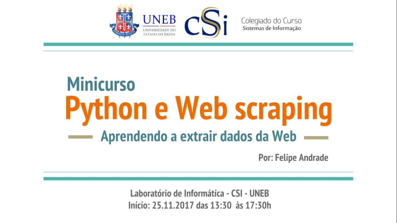 INF DCETI Inscrição - 21/11/2017 à 17/12/2017Este evento se configura como um minicurso voltado a Introduzir aos alunos a mineração de dados, que é uma área que exige uma alta demanda de profissionais, e está sendo muito utilizada por grandes empresas como Google, Facebook e Netflix. Para isso será utilizado o Python que é uma linguagem simples e potente sendo uma das mais usadas para análise, manipulação e processamento de dados. Duração prevista de 3 sábados, totalizando 12 horas de carga horaria. O Curso será ministrado pelo Instrutor Felipe Andrade Silva, no laboratório de informatica II do Curso de Bacharelado em Sistemas de Informação.