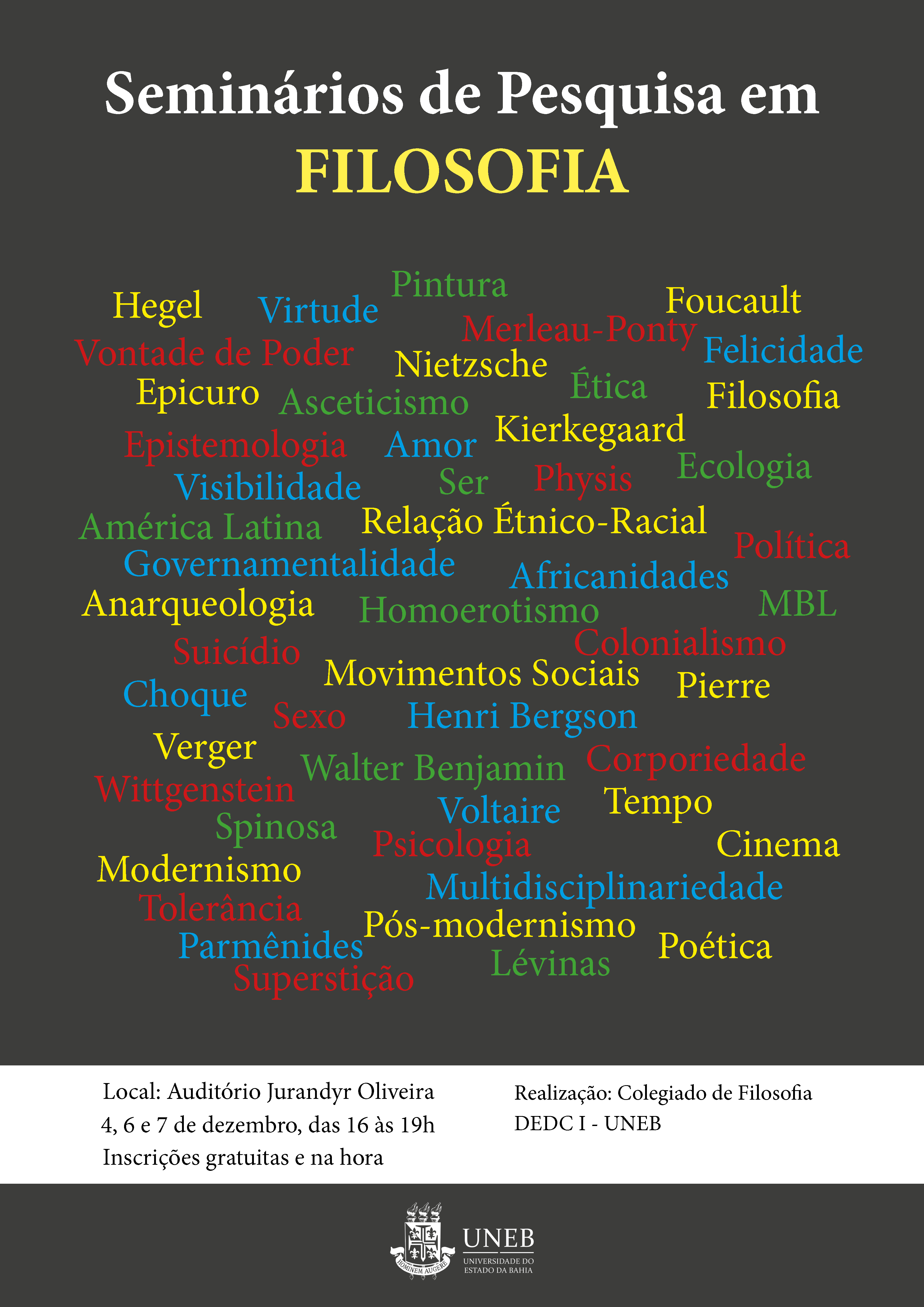 NUPE DEDC I Inscrição - 01/12/2017 à 07/12/2017Sobre o evento Os Seminários de Pesquisa em Filosofia pretendem divulgar pesquisas recentes na área de filosofia, destacando o método usado e os principais resultados de cada investigação filosófica. O primeiro módulo é composto de apresentações de professores que apresentam suas respectivas pesquisas ao nível de mestrado ou doutorado, servido de paradigmas para os discentes-pesquisadores que fazem TCC em Filosofia. O segundo módulo é apresentado pelos discentes, como forma de sintetizar os primeiros resultados de sua pesquisa e divulgá-los e de dominar a técnica da comunicação acadêmica. Ao divulgar pesquisas recentes em Filosofia, os seminários oferecem paradigmas aos iniciantes na pesquisa, introduzindo-os em questões de ordem metodológicas próprias da área. Ao mesmo tempo, informa a comunidade acadêmica local das últimas reflexões sobre temas filosóficos relevantes. E constituem como oportunidade para os discentes matriculados em TCC I do Curso de Filosofia de apresentarem seus projetos de pesquisa e dialogarem sobre pesquisas em construção, logo, de uma experiência de comunicação acadêmica. Por último, fornece certificado, com carga horária aproveitável para ACC. Objetivos · ü Motivar a pesquisa na área de filosofia; · ü Apresentar paradigmas metodológicos de pesquisa em filosofia; · ü Ser uma oportunidade de experiência de apresentação de pesquisa para os formandos; · ü Fornecer certificado para uso de carga horária de ACC. Dados Gerais Data: 4, 6 e 7 de dezembro de 2017 Horário: das 16 às 19 horas. Local: Auditório Jurandir Olivera - DEDC 1 Paletrantes: discentes/pesquisadores nas áreas comuns a temática.