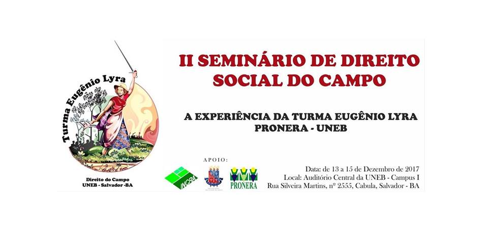 PRONERA Inscrição - 05/12/2017 à 15/12/2017O Seminário Temático Final é uma forma de socialização da experiência de conclusão do Curso de Graduação em Direito do Programa Nacional de Educação na Reforma Agrária- PRONERA/UNEB e congregará a comunidade acadêmica (professores, estudantes, servidores técnicos), representantes das comunidades envolvidas e pesquisadas, movimentos sociais e organizações da sociedade civil, sendo um espaço de fortalecimento das resistências e renovação de utopias em um momento político de crescente retirada de direito no país, especialmente de desestruturação do PRONERA. Destaca-se a importância deste momento, tendo em vista que, historicamente, o ensino jurídico no Brasil foi direcionado a uma classe privilegiada. Reforçamos com o nosso Seminário a necessidade de um ensino jurídico voltado para atender os anseios dos trabalhadores e trabalhadoras para ocupar o latifúndio saber. A Turma de Direito Eugênio Lyra, neste processo, é fruto da luta dos movimentos sociais e sindicais. Esta é a primeira turma de Direito pelo PRONERA do Nordeste brasileiro a concluir o curso em 2017, a mesma é composta por 44 estudantes de 3 estados dos Brasil e de 11 movimentos sociais de luta pela terra. Assim, este seminário tem por finalidade elencar os meios e formas para devolver às comunidades o aprendizado adquirido durante os 5 anos de curso na perspectiva de potencializar a luta da classe trabalhadora. Contaremos com mesas com palestrantes renomados e comprometidos com as lutas sociais, grupos temáticos com a exposição das pesquisas desenvolvidas pelos estudantes mediadas pela intervenção e análises de debatedores, além de exposição fotográfica e atividade cultural. Ressalte-se também o lançamento da publicação, em formato livro, acerca da experiência da Turma Especial, organizada e com a participação de professores do curso, através da EDUNEB e EDUFBA. Ademais, possuirá carga horária de 25 horas certificadas pela UNEB. O II Seminário de Direito Social do Campo ocorrerá entre os dias 13 e 15 de dezembro na Universidade do Estado da Bahia - UNEB e no Centro de Treinamento da SDR (na Rua da EBDA, fundo do Parque de Exposições na Avenida Dorival Caymmi - Itapuã). Contamos com a sua participação!