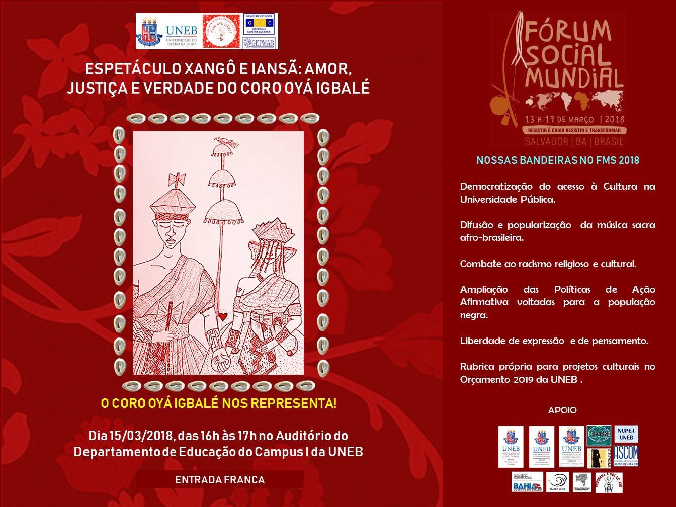 NUPE DEDC I Inscrição - 13/03/2018 à 16/03/2018No dia 15 de março de 2018, das 16h às 17h0min, acontece no Auditório Jurandyr Oliveira do Departamento de Educação do Campus I da UNEB o Espetáculo Xangô e Iansã: Amor, Justiça e Verdade realizado pelo Coro Oyá Igbalé: Música Sacra de Matriz Afro-brasileira (DEDC-I/UNEB). A apresentação integra o FÓRUM MUNDIAL SOCIAL 2018; e, propõe com música a reflexão sobre a Justiça e a Paz com o repertório dedicado para os Orixás que tem em comum os elementos: Amor, Justiça e Fogo (além do Raio). O Coro Oyá Igbalé apresenta como bandeiras para o Fórum Mundial Social 2018 e para a UNEB as bandeiras: Democratização do acesso à Cultura na Universidade Pública; difusão e popularização da música sacra afro-brasileira; combate ao racismo religioso e cultural; ampliação das Políticas de Ação Afirmativa voltadas para a população negra; liberdade de expressão e de pensamento; rubrica própria para projetos culturais no Orçamento 2019 da UNEB. O Coro Oyá Igbalé defende a difusão e popularização responsável da música sacra afro-brasileira. Corresponde a uma ação afirmativa nas áreas de educação e cultura, integrando a comunidade acadêmica da UNEB e a comunidade externa. A realização no dia 15 de dezembro de 2017 do espetáculo dedicado para os Orixás Iansã e Xangô é além de uma “celebração musical” um apelo na defesa da Justiça, da Paz e da democratização e valorização da cultura oriunda dos povos da Diáspora Africana. O projeto é vinculado ao Grupo de Estudos em Estética e Contracultura (GEEC) e ao Grupo de Estudos e Pesquisas da Memória Afro-baiana (GEEPMAB). Possui como parceiros institucionais a Direção do Departamento de Educação do Campus I da UNEB, Pró-reitoria de Ações Afirmativas (PROAF), Pró-reitoria de Extensão (PROEX), Centro de Estudos dos Povos Afro-Índio-Americano (CEPAIA), Assessoria Especial para Projetos Interinstitucionais (ASSSEPAI), Centro de Pesquisa em educação e Desenvolvimento Regional, ASCOM e NUPE-I. Conta com o apoio cultural Edital para Promoção de Eventos PROEX-UNEB/2017, da SEPROMI-BA, IRDEB, Governo do Estado da Bahia, Rádio Motumbá: A Voz do Axé, Ori Filmes, Narrany Turismo e Eventos e Teatro UNEB. O repertório contempla cantigas das Nações do Candomblé Kêto e Banto; além, de músicas da MPB que possuem enraizamento na tradição da Música Sacra Afro-brasileira. O repertório está dividido em três artes, a saber: cantigas dedicadas para Oxalá e Iemanjá (abertura); cantigas e músicas dedicadas para os Orixás Iansã e Xangô; e, cantigas e músicas dedicadas para os Orixás Oxum e Oxalá. A entrada é franca e o acesso do Público acontece a partir das 15h30min; o Espetáculo acontece das 16h às 17h30min. Auditório Jurandyr Oliveira está localizado na Rua Silveira Martins, 2555, Cabula. CEP 41. 150-000. Salvador/BA. Dentre os principais objetivos do trabalho realizado pelo Coro Oyá Igbalé, destacam-se: a difusão e popularização da música sacra afro-brasileira; promoção do debate sobre ampliação de políticas institucionais de combate ao racismo religioso e defesa da dignidade da pessoa humana; realização da democratização do acesso à cultura; fomento à inclusão da população negra e das comunidades de matriz afro-brasileira no espaço da Universidade Pública; defesa da liberdade de expressão e combate ao racismo religioso e cultural. A coordenação geral do projeto Coro Oyá Igbalé pede para que o público que, assim como a “Família Coro Oyá Igbalé”, vista-se de Paz (roupa branca). Informações podem ser solicitadas pelo (ZAP) 98524-0462. Instagram: @corooyauneb.