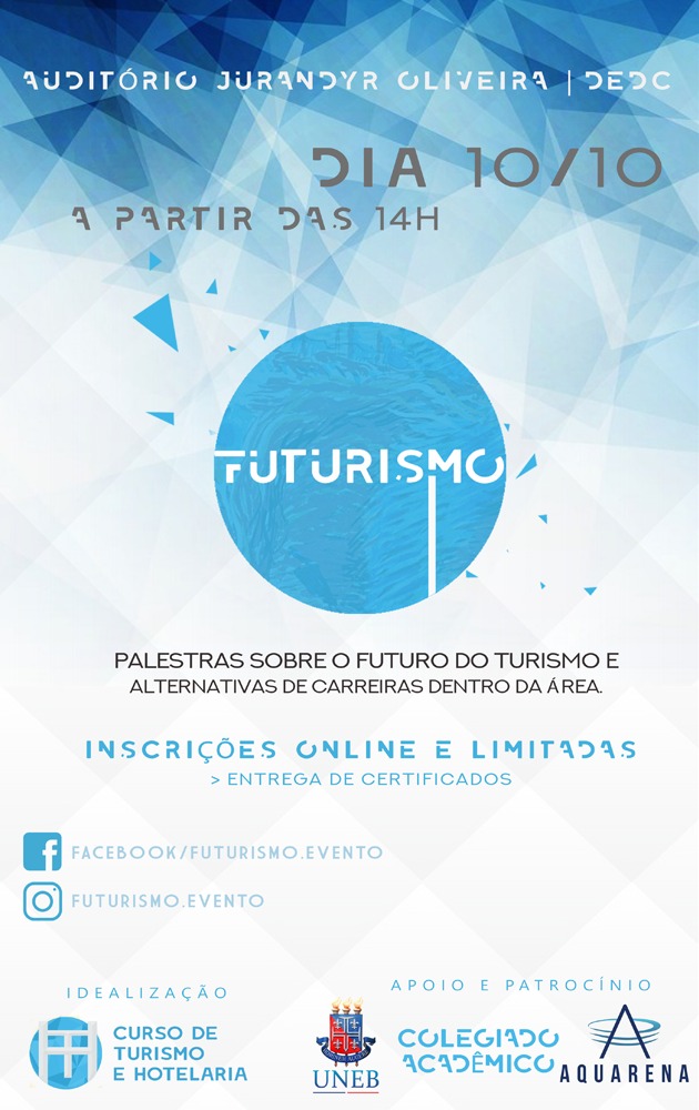 TUR DCHI Inscrição - 26/09/2017 à 10/10/2017Analisando o ambiente acadêmico que vivenciamos atualmente e a situação econômica dos atuantes da área de turismo, percebem-se as diferentes áreas de atuações que veem ao longo do tempo sofrendo alterações no universo turístico, esse fenômeno processual desencadeia uma série de expectativas nos graduando da área. Com isso cria-se a necessidade de observar e planejar o desenvolvimento dessas novas áreas vinculadas ao fluxo turístico no meio acadêmico. A discussão da temática Futurismo, busca ampliar as possibilidades de atuação no mercado de trabalho pelos Bacharéis de Turismo e Hotelaria. Apresentação Evento Futurismo será realizado na Universidade do Estado da Bahia no dia 10/10/2017, através dos discentes do curso de Turismo e Hotelaria. Objetivo O objetivo desse evento será trazer motivação aos graduandos de Turismo e Hotelaria, outros estudantes que tenham interesse na área, mostrando a estes diferentes possibilidades no mercado de trabalho, distintas das que nos são apresentadas dentro do curso. Certificações Serão entregue os certificados aos ouvintes com carga horária de 04 (quatro) horas via e-mail, emitidos pela Universidade do Estado da Bahia (UNEB). Programação do Evento DATA HORÁRIO ATIVIDADES 10/10/2017 14h00min Credenciamento 10/10/2017 14h30min Abertura Oficial do Evento - Montagem da mesa 10/10/2017 14h40min Palestra: Uma trilha na viagem das oportunidades, ministrada pela Turismóloga Viviane Lafene 10/10/2017 15h40min Encerramento da palestra: Uma trilha na viagem das oportunidades, ministrada pela Turismóloga Viviane Lafene 10/10/2017 15h50min Palestra: O turismo autossustentável e o gerenciamento costeiro em Salvador, ministrada por Jorge Santana 10/10/2017 16h50min Encerramento da palestra: O turismo autossustentável e o gerenciamento costeiro em Salvador ministrada por Jorge Santana 10/10/2017 17h00min Debate com mediação 10/10/2017 18h00min Encerramento do debate
