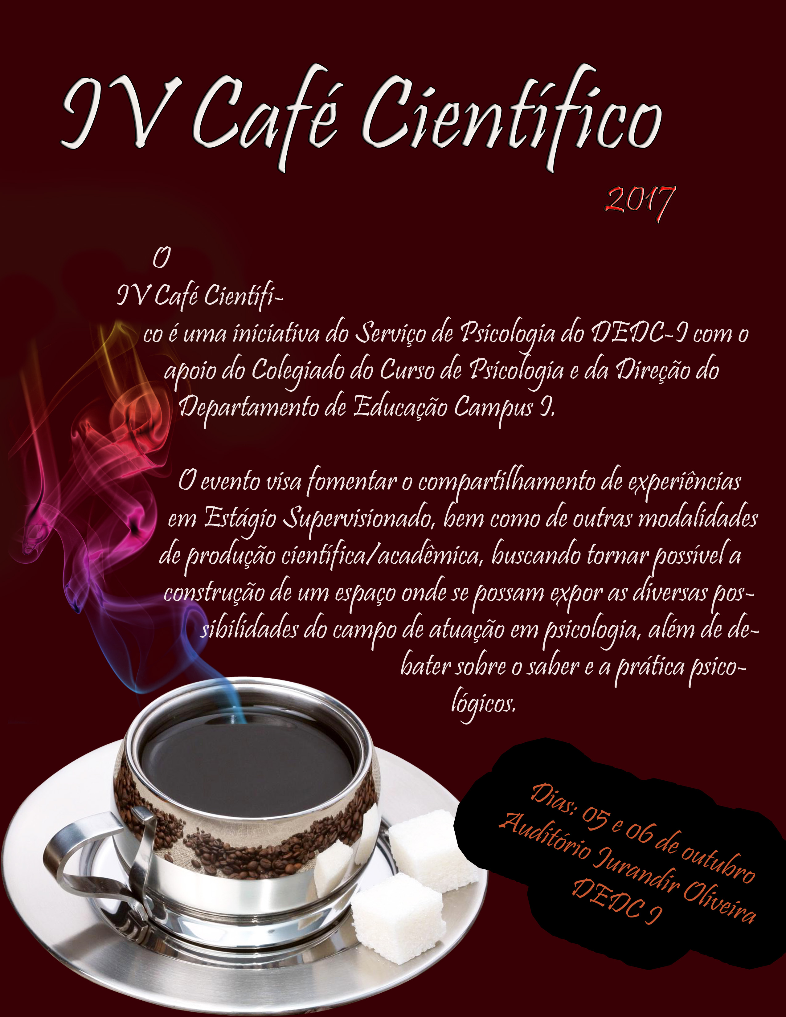 NUPE DEDC I Inscrição - 29/09/2017 à 06/10/2017O IV Café Científico é uma iniciativa do Serviço de Psicologia do DEDC-I com o apoio do Colegiado do Curso de Psicologia e da Direção do Departamento de Educação Campus I. O evento visa fomentar o compartilhamento de experiências em Estágio Supervisionado, bem como de outras modalidades de produção científica/acadêmica, buscando tornar possível a construção de um espaço onde se possam expor as diversas possibilidades do campo de atuação em psicologia, além de debater sobre o saber e a prática psicológicos.